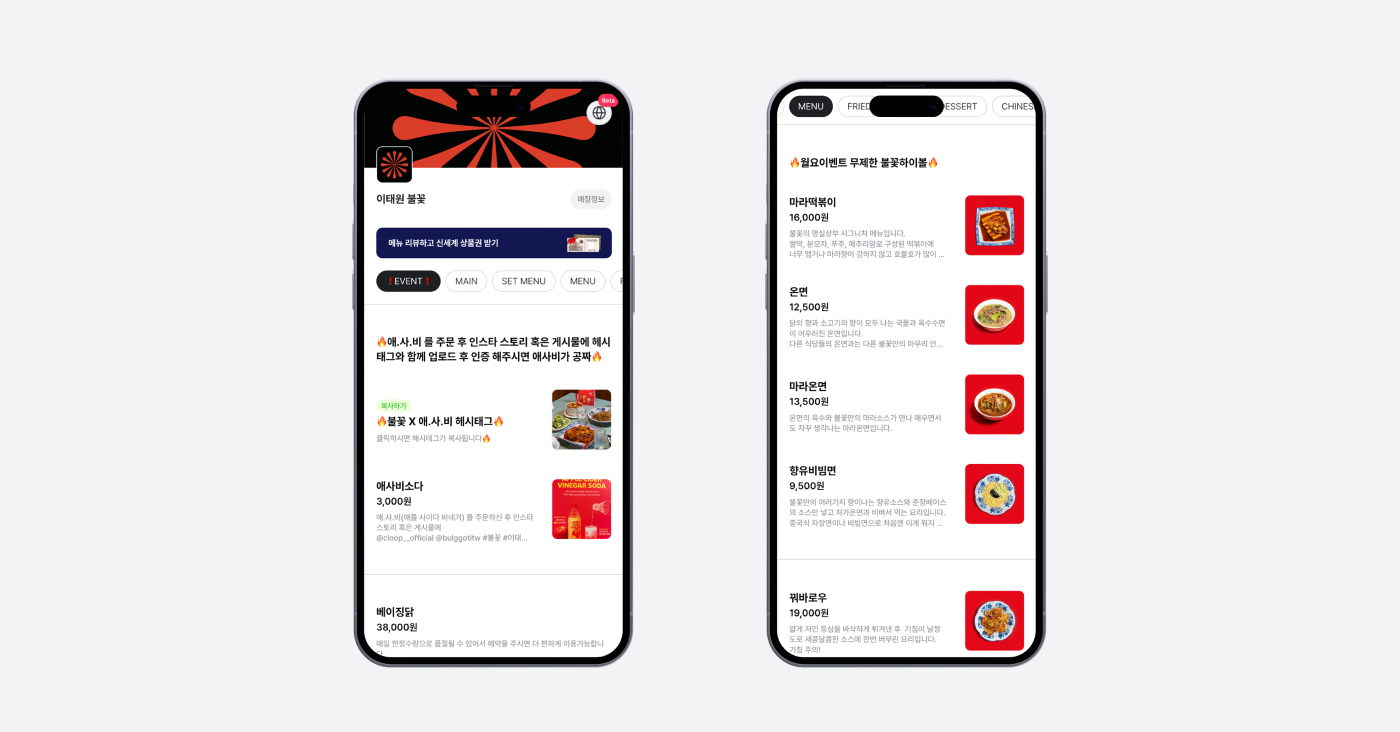 이태원 불꽃 매장은 중식 기반의 메뉴를 선보이는