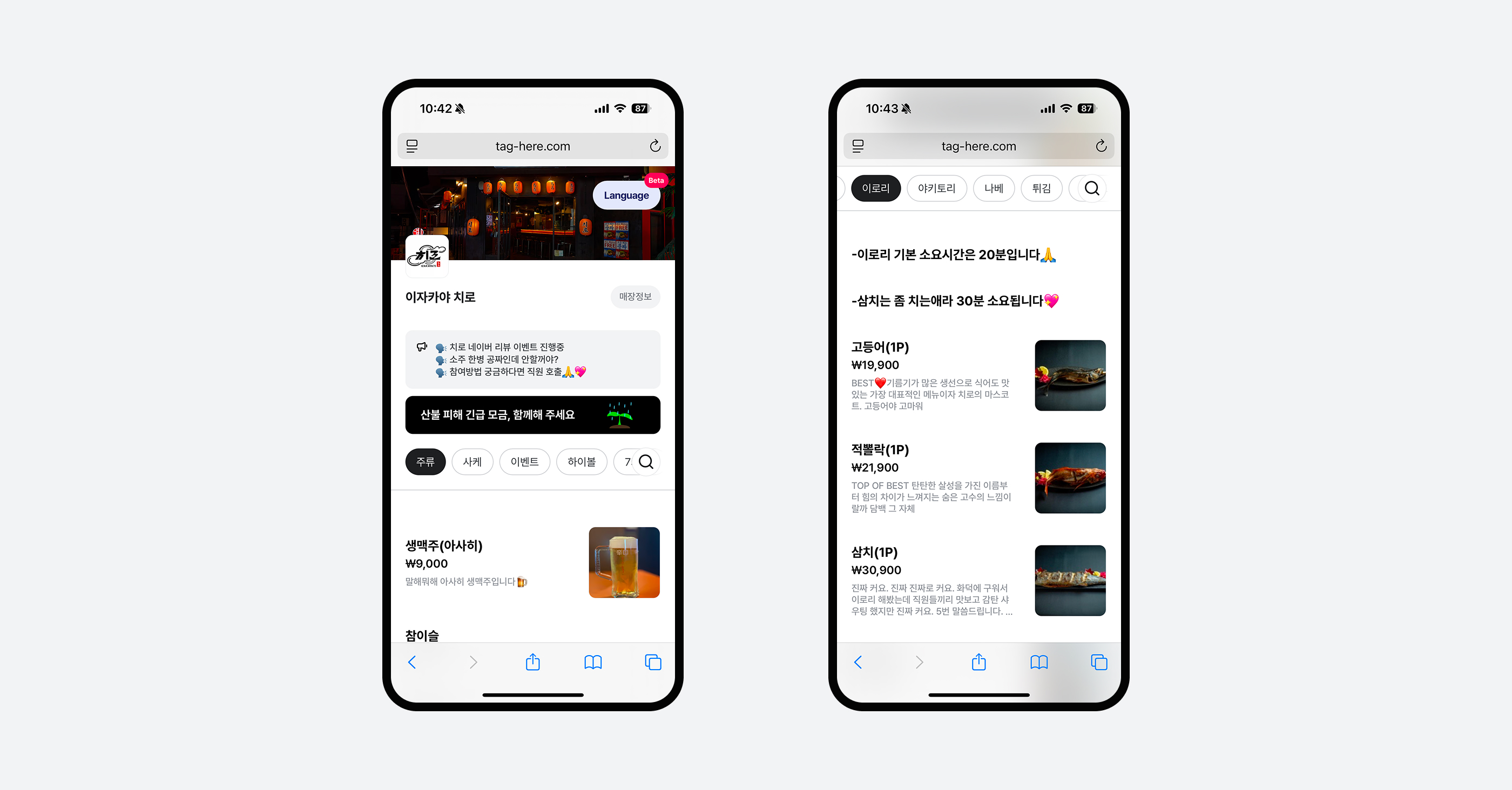 이자카야 치로는 이로리 메뉴 매장인데요,