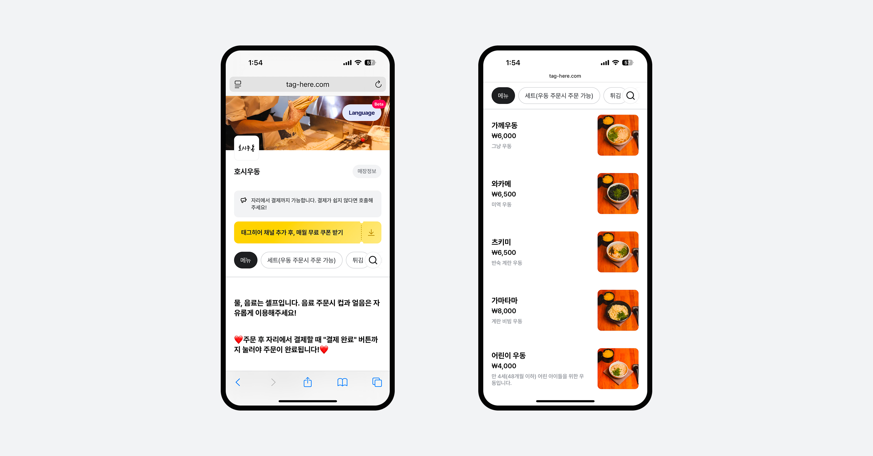 호시우동 태그히어 메뉴판
