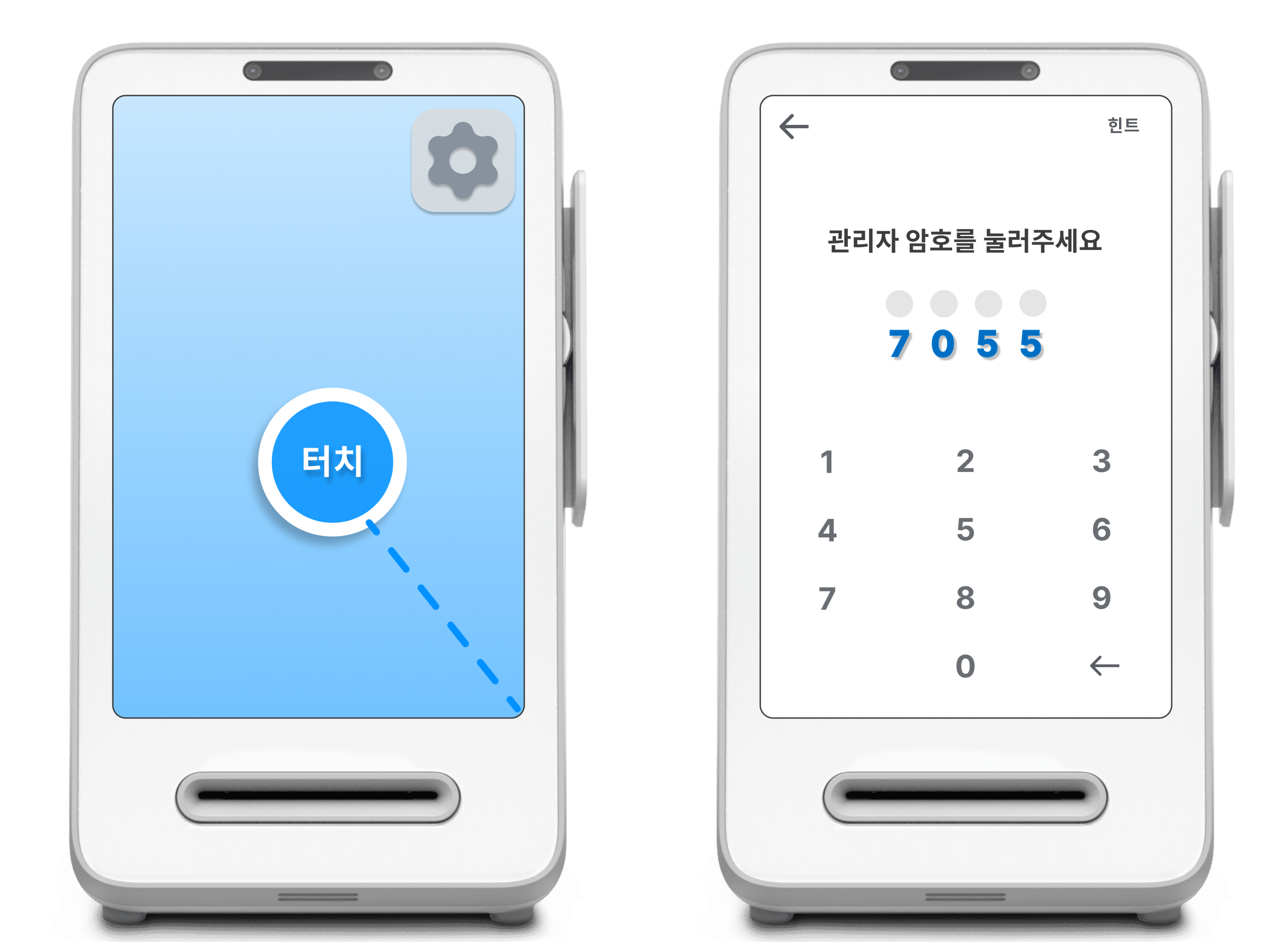 프론트 화면 터치 → 오른쪽 상단 톱니바퀴⚙️를 눌러 관리자 모드로 진입해주세요