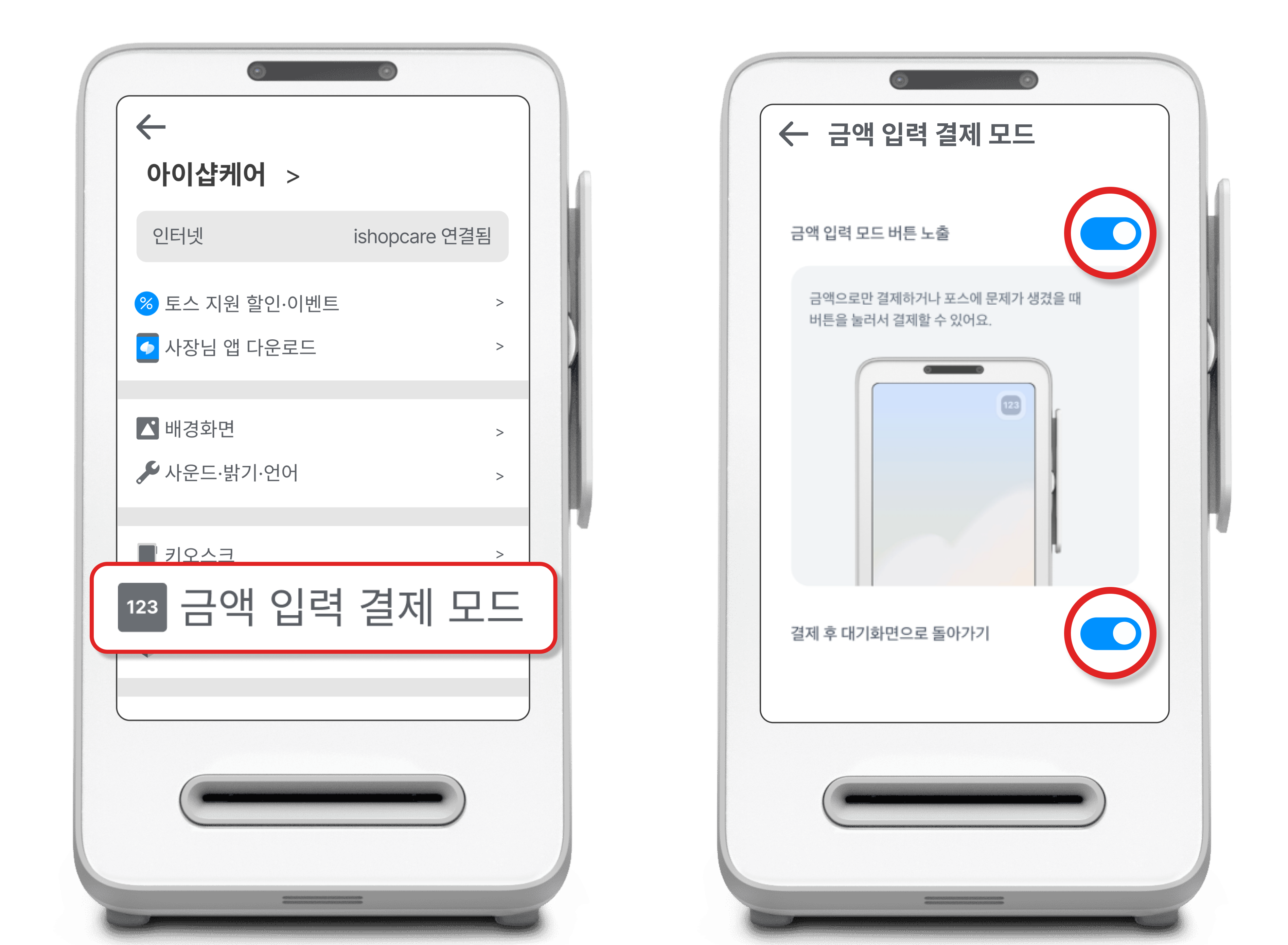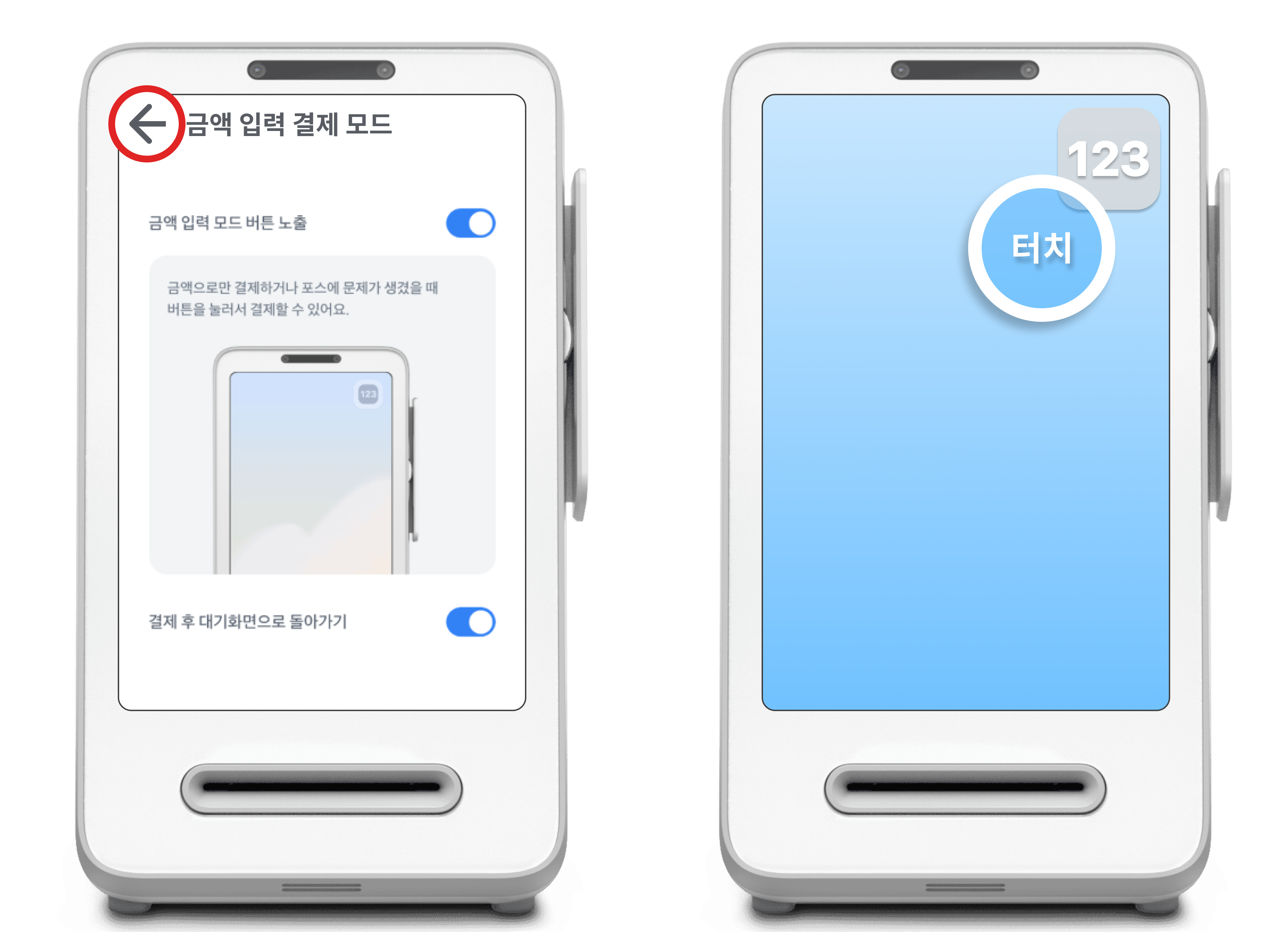 [금액 입력 결제 모드] → 두개의 버튼을 모두 파란색으로 활성화 시켜주세요