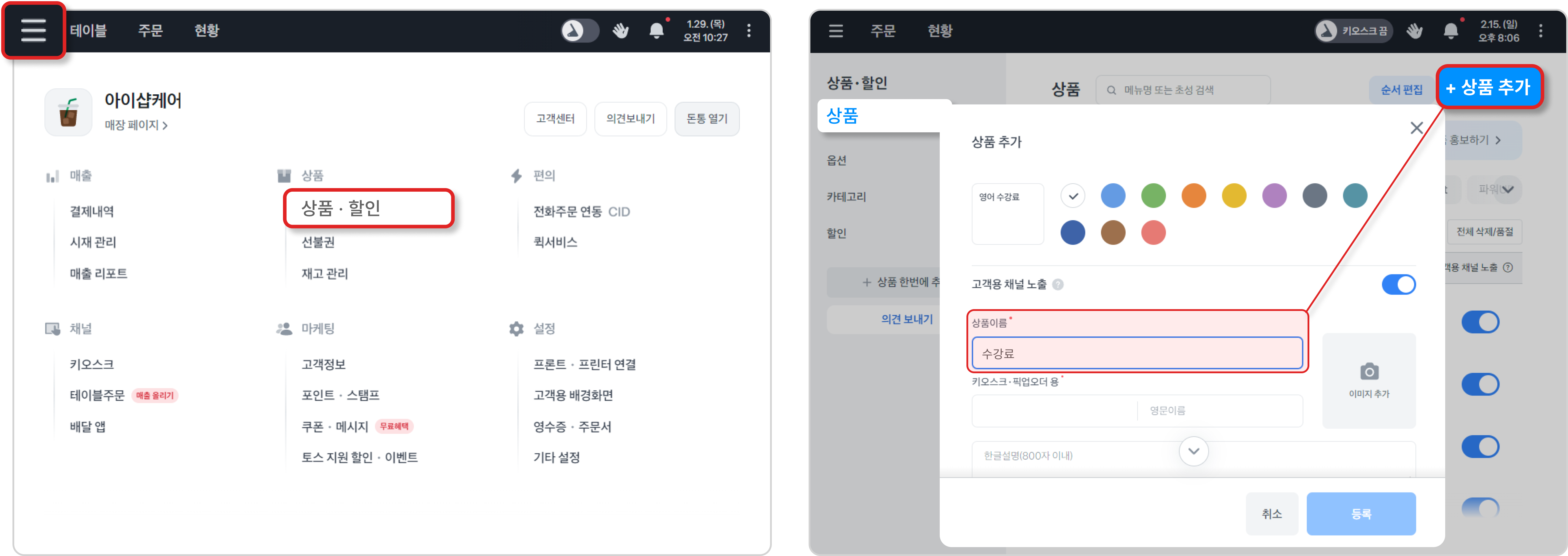 왼쪽 상단 ≡ → [상품·할인] → [+ 상품추가] → 상품 이름 을 기재해 주세요.