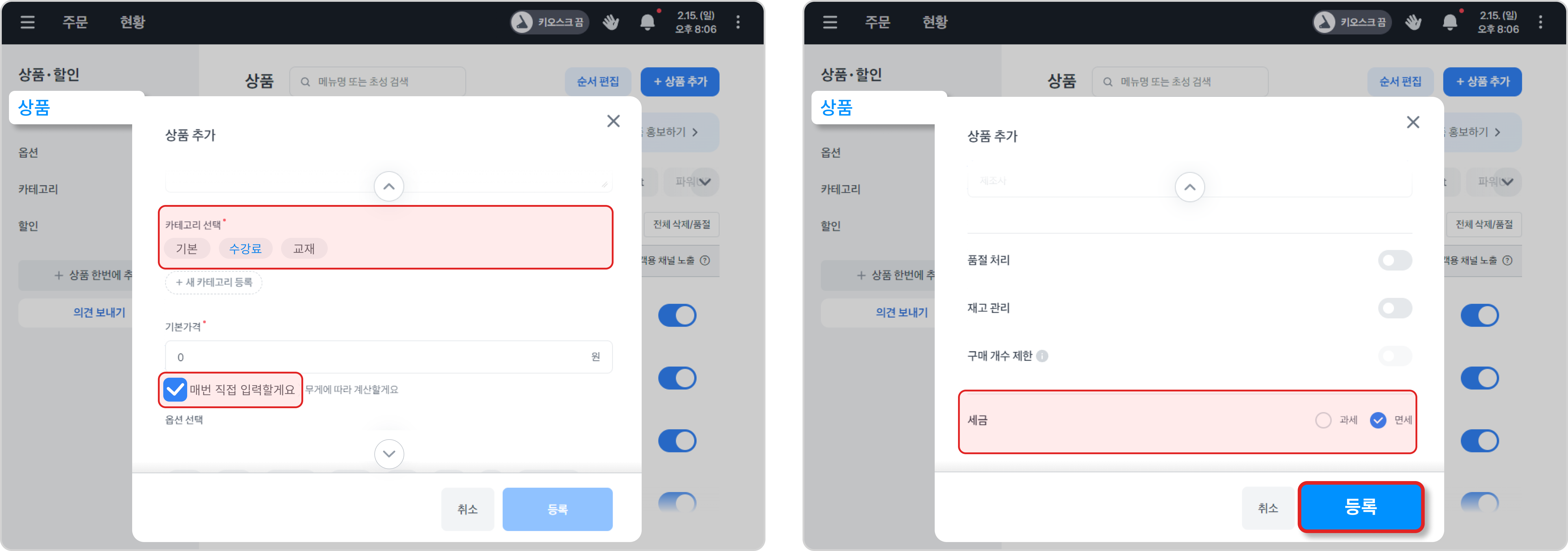 매번 직접 입력할게요를 선택해 주세요.최하단 [과세 / 면세] 여부 체크 후 [등록]을 눌러주세요.