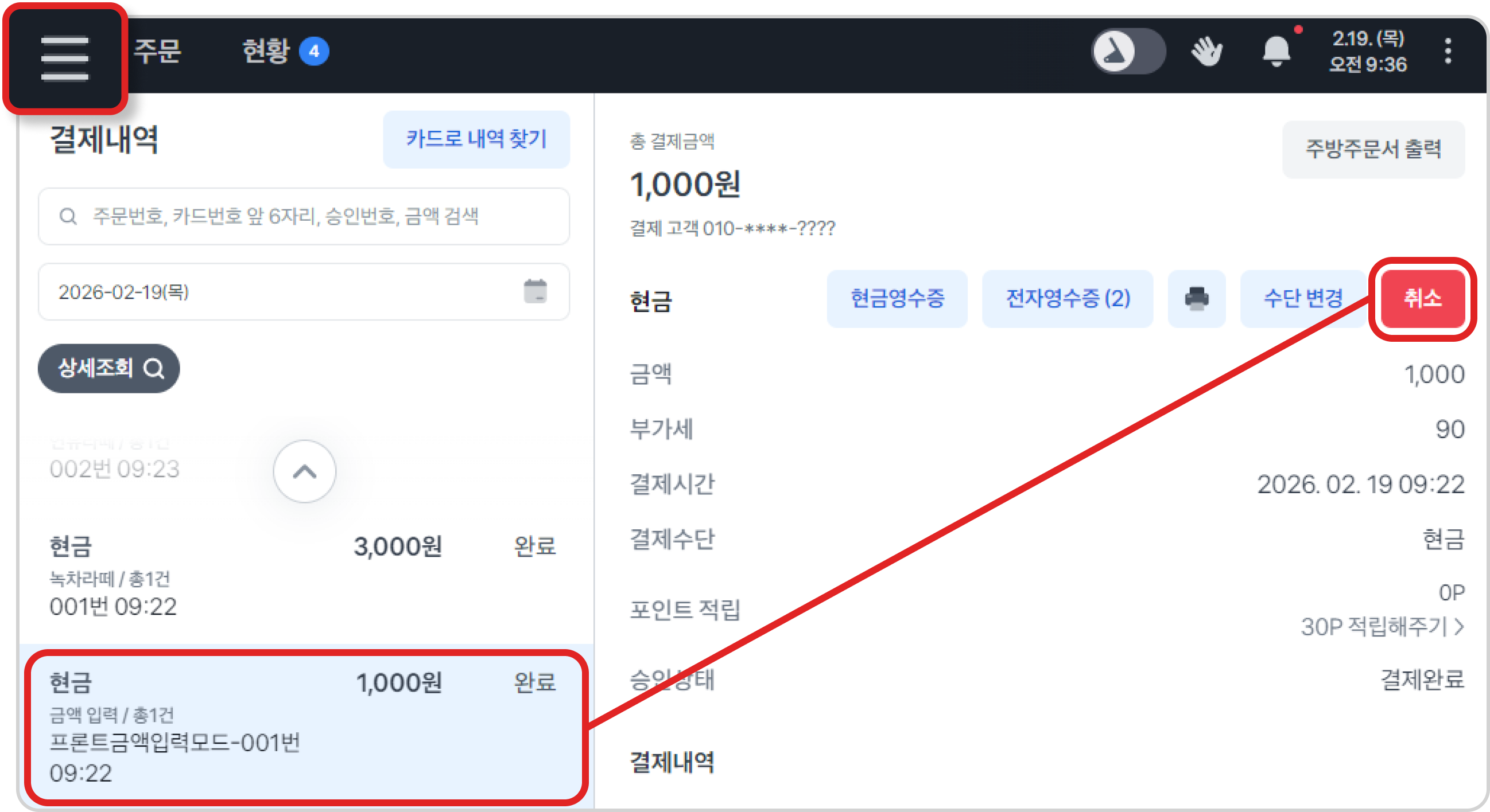 취소 방법 : 왼쪽 상단 ≡ → 결제내역 → 결제건 선택 → [취소]