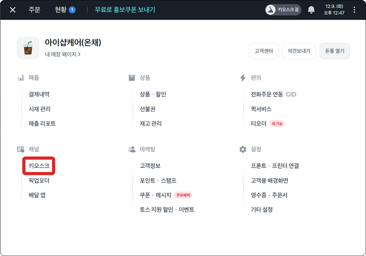 토스포스 왼쪽 상단 ≡ → 키오스크