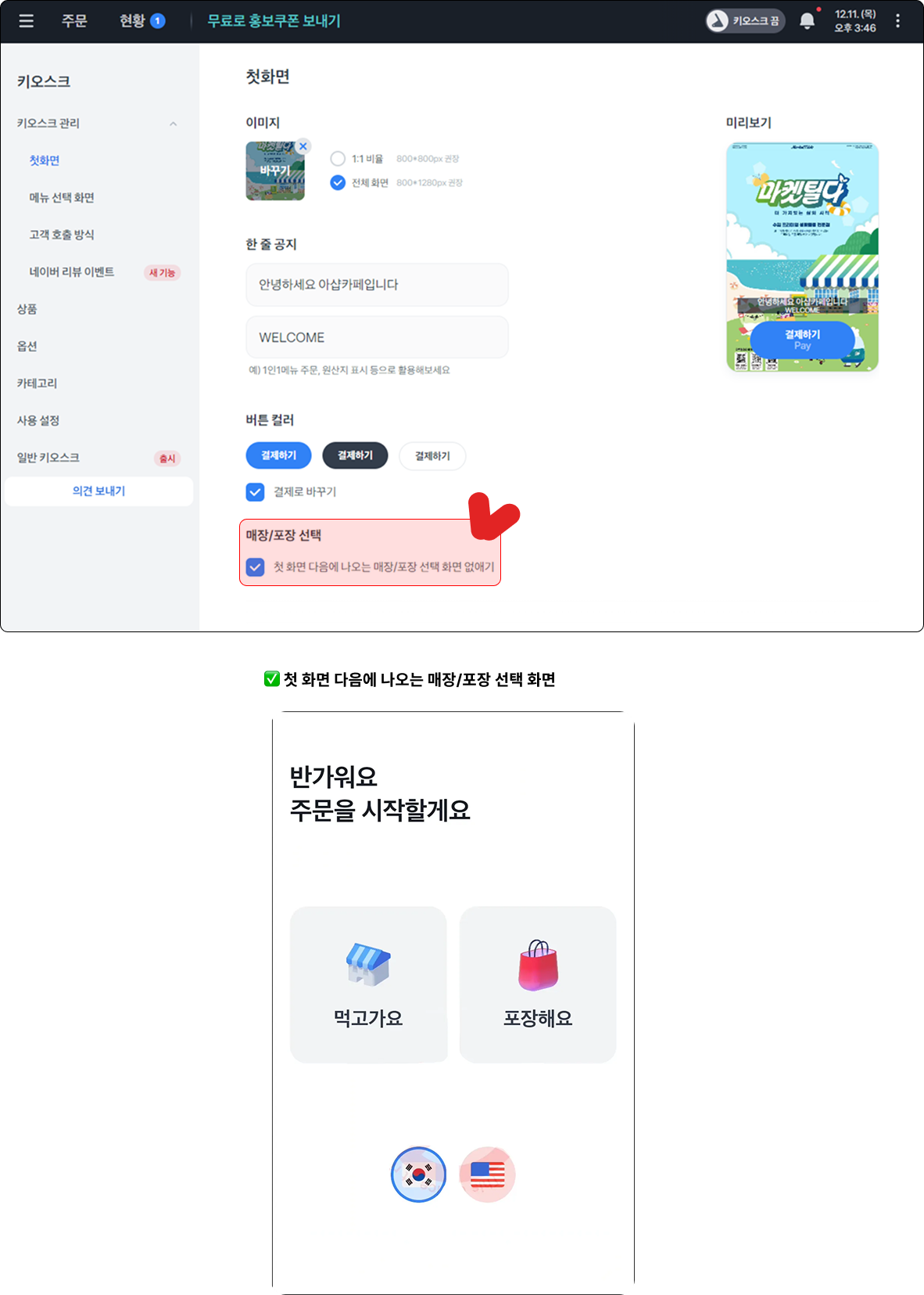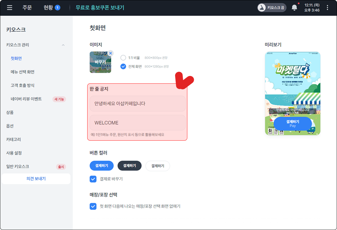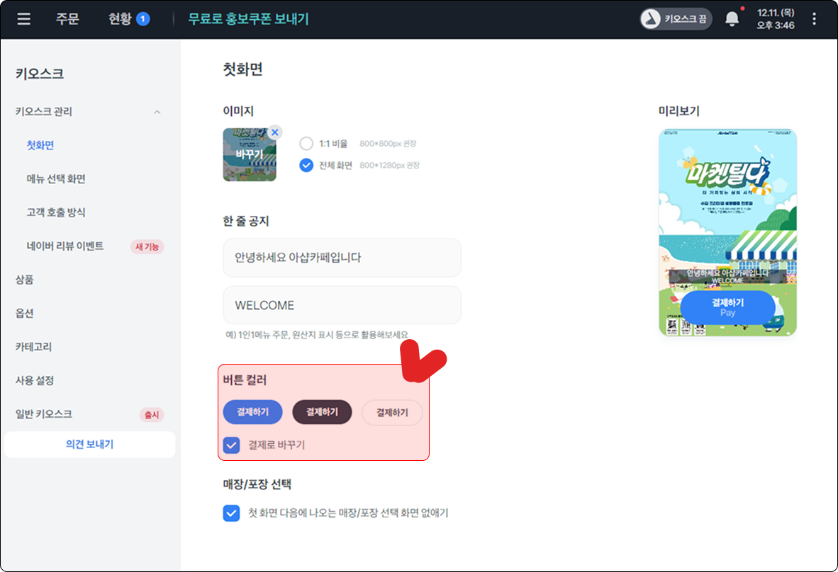 키오스크 첫 화면 사진을 설정 할 수 있어요.