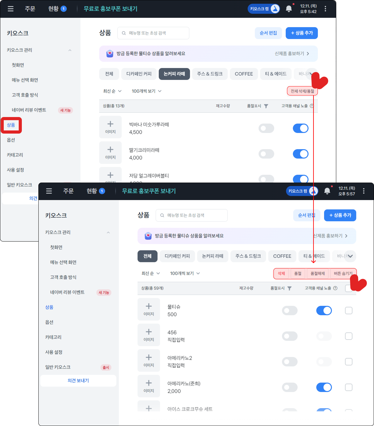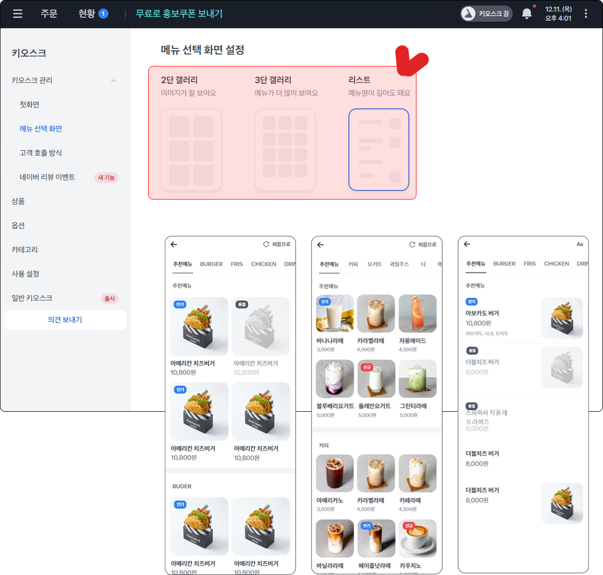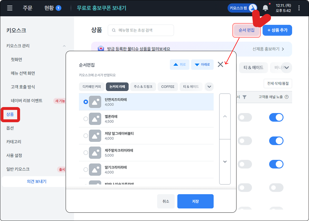 키오스크에 보여지는 상품 순서는 우측 상단