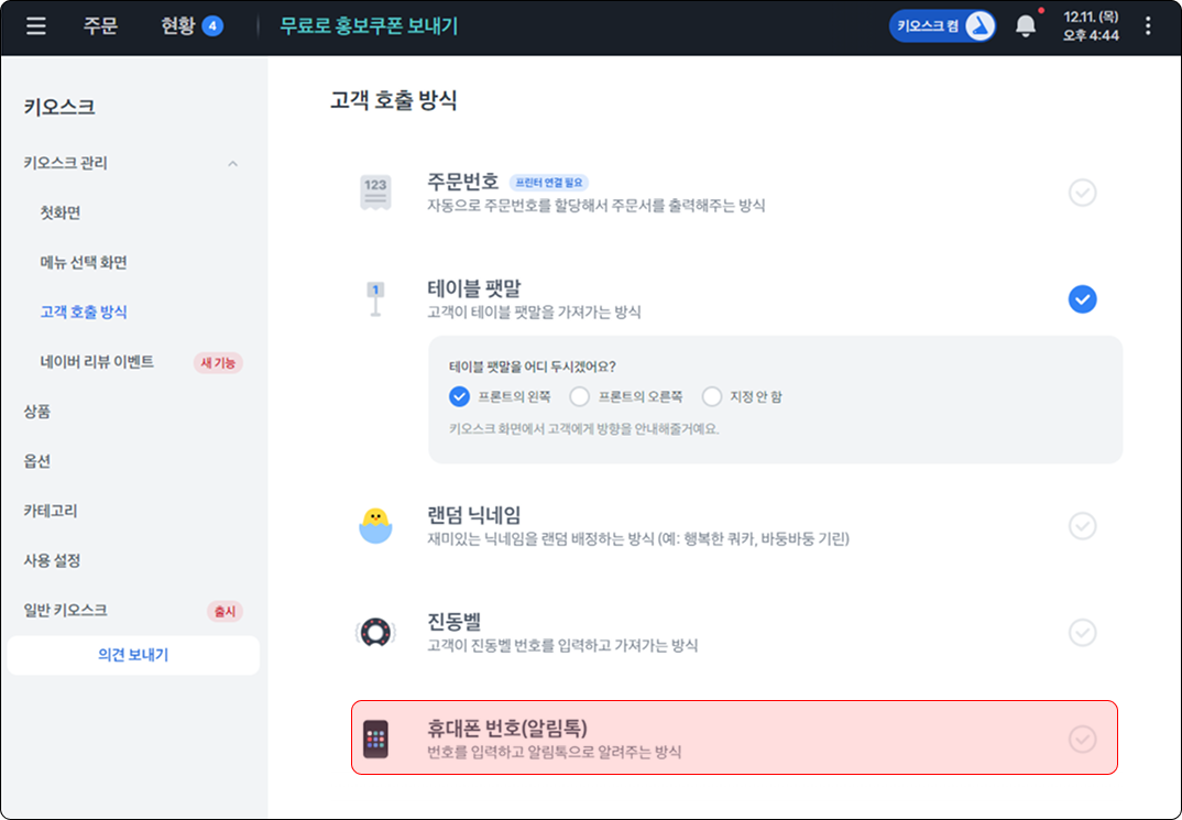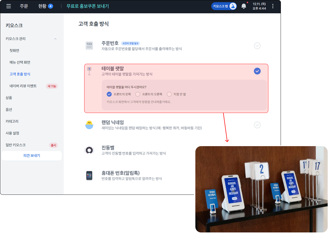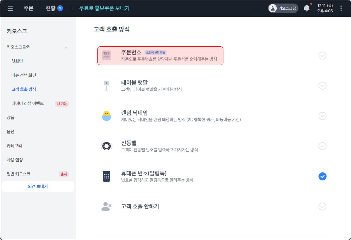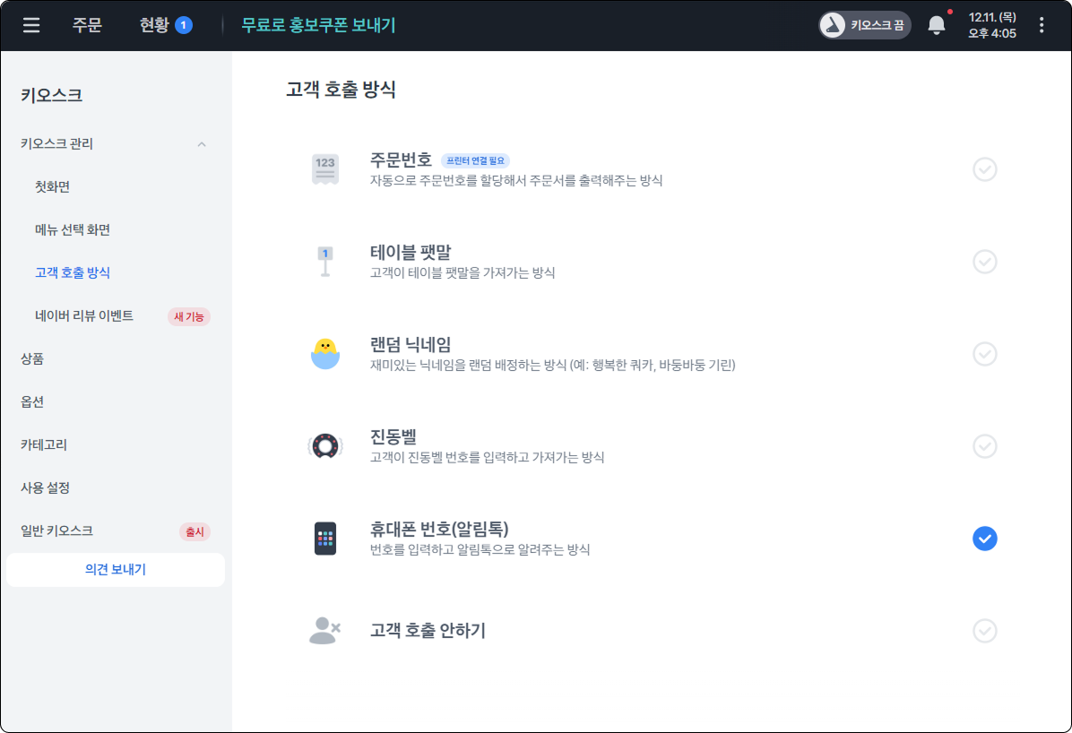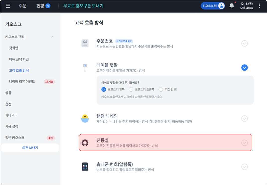 메뉴 주문 화면에 진동벨 번호 입력하면 호출 되는 기능이에요.