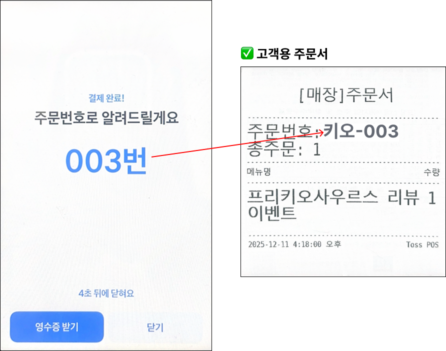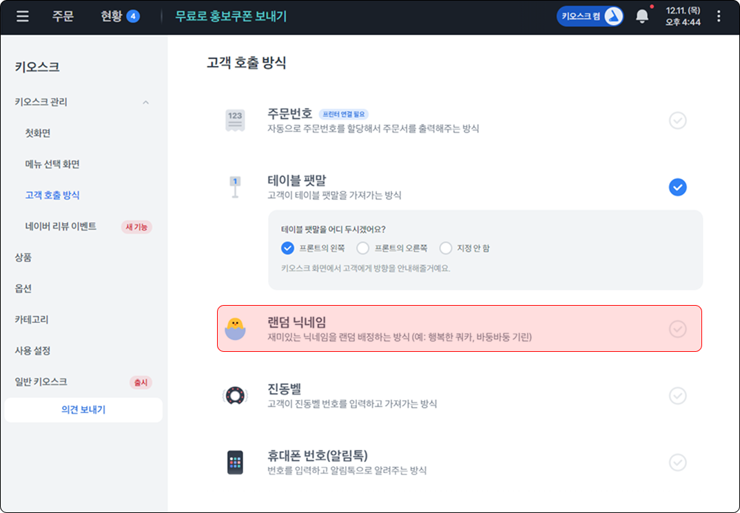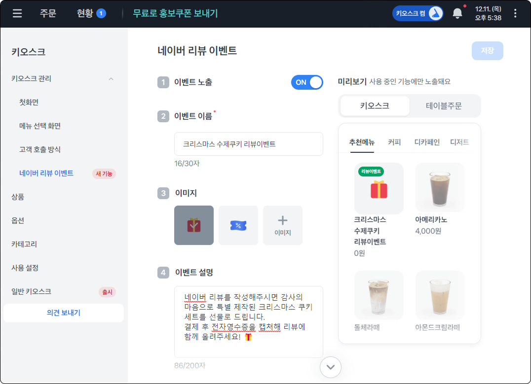 네이버 리뷰 이벤트를 활성화하면, 키오스크 주문 화면에서 가장 첫 번째 상품으로 노출돼요.