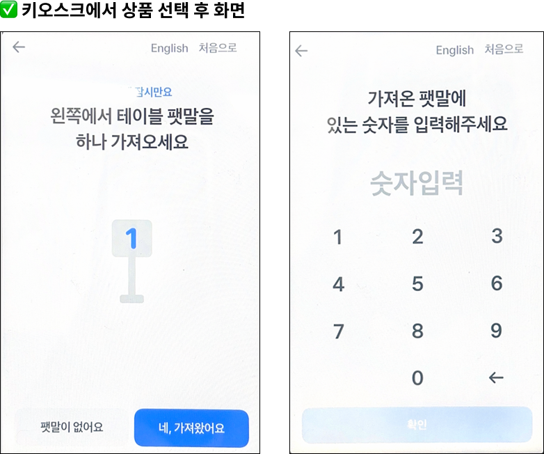 세워져 있는 팻말을 가져온 뒤, 팻말 번호를 화면에 입력해주세요.