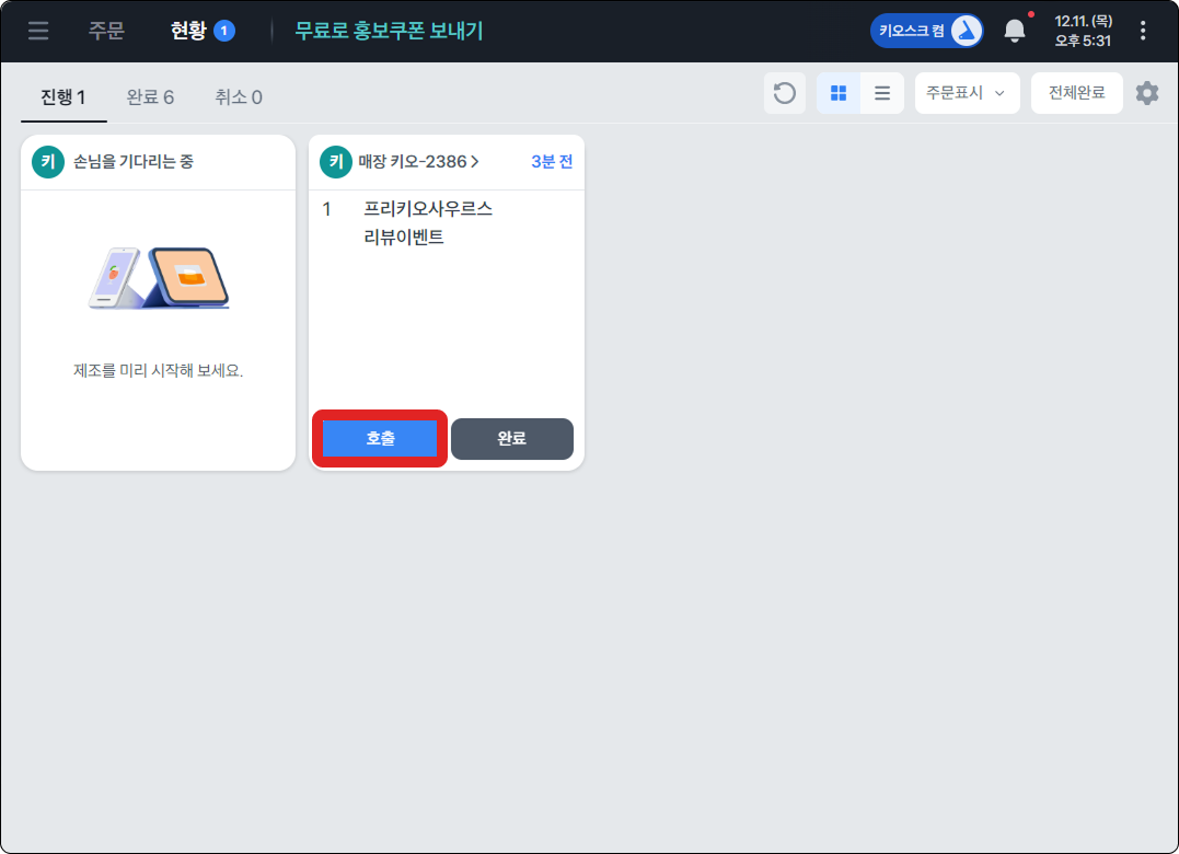 알림톡 호출은 토스포스 [현황]에 호출 버튼이 생겨요.