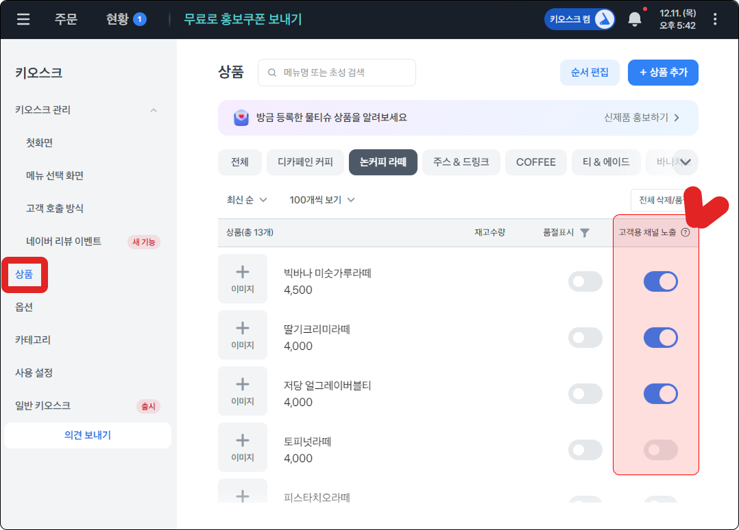 토스포스 왼쪽 상단 ≡ → 키오스크 → 상품 → 우측 [고객용 채널 노출]을 활성화 해야 키오스크에 메뉴가 보여져요.