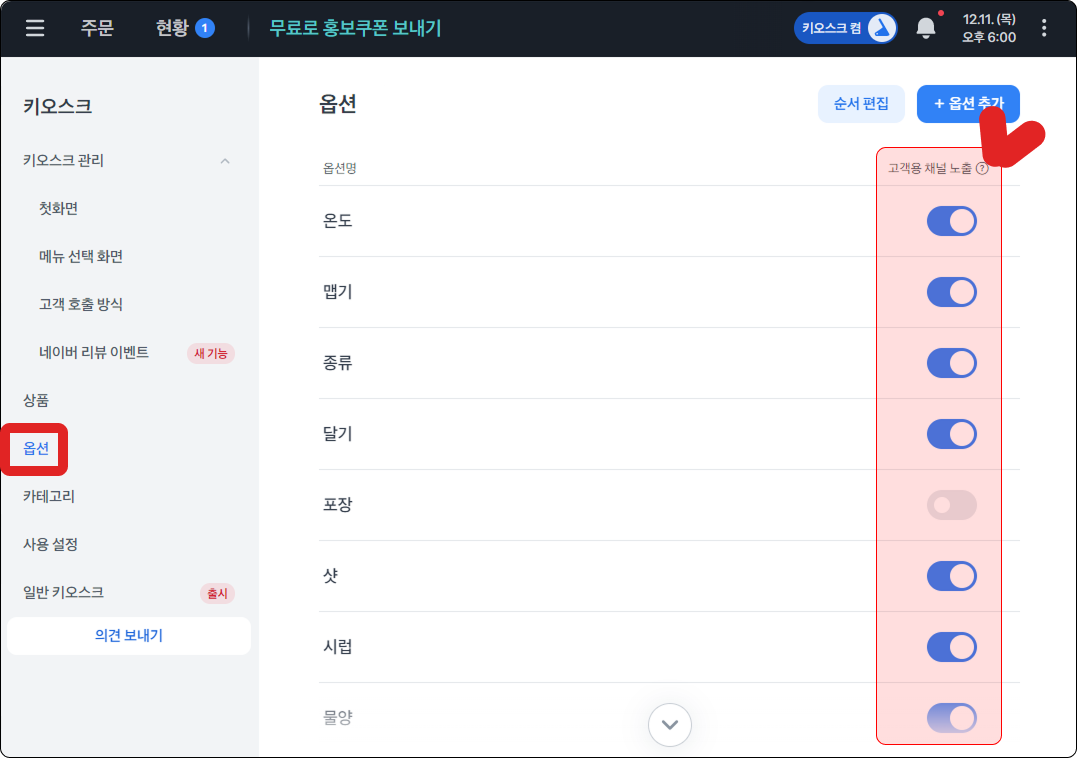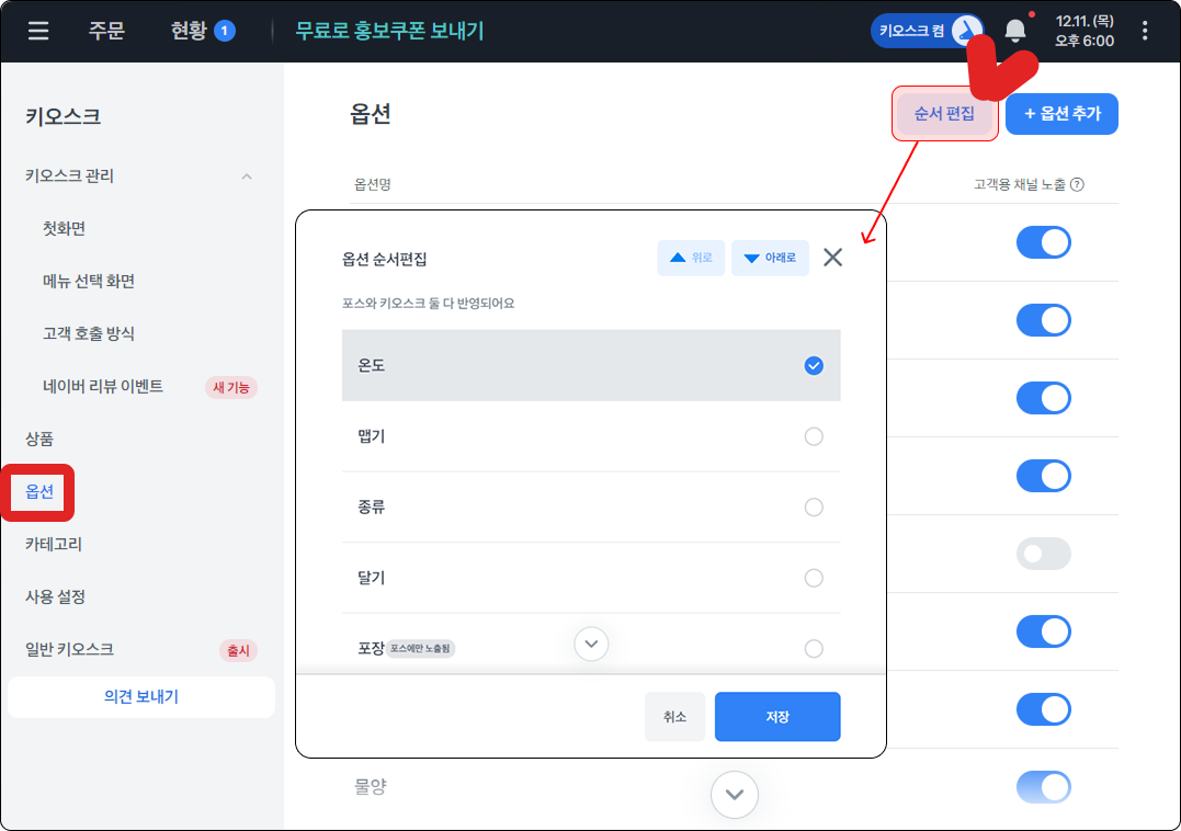 키오스크에 보여지는 옵션 순서는 우측 상단