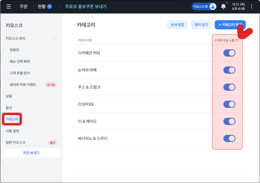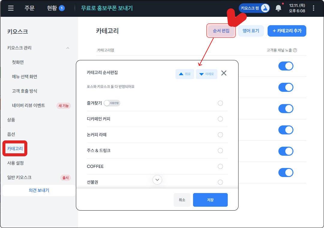 키오스크에 보여지는 카테고리 순서는 우측 상단