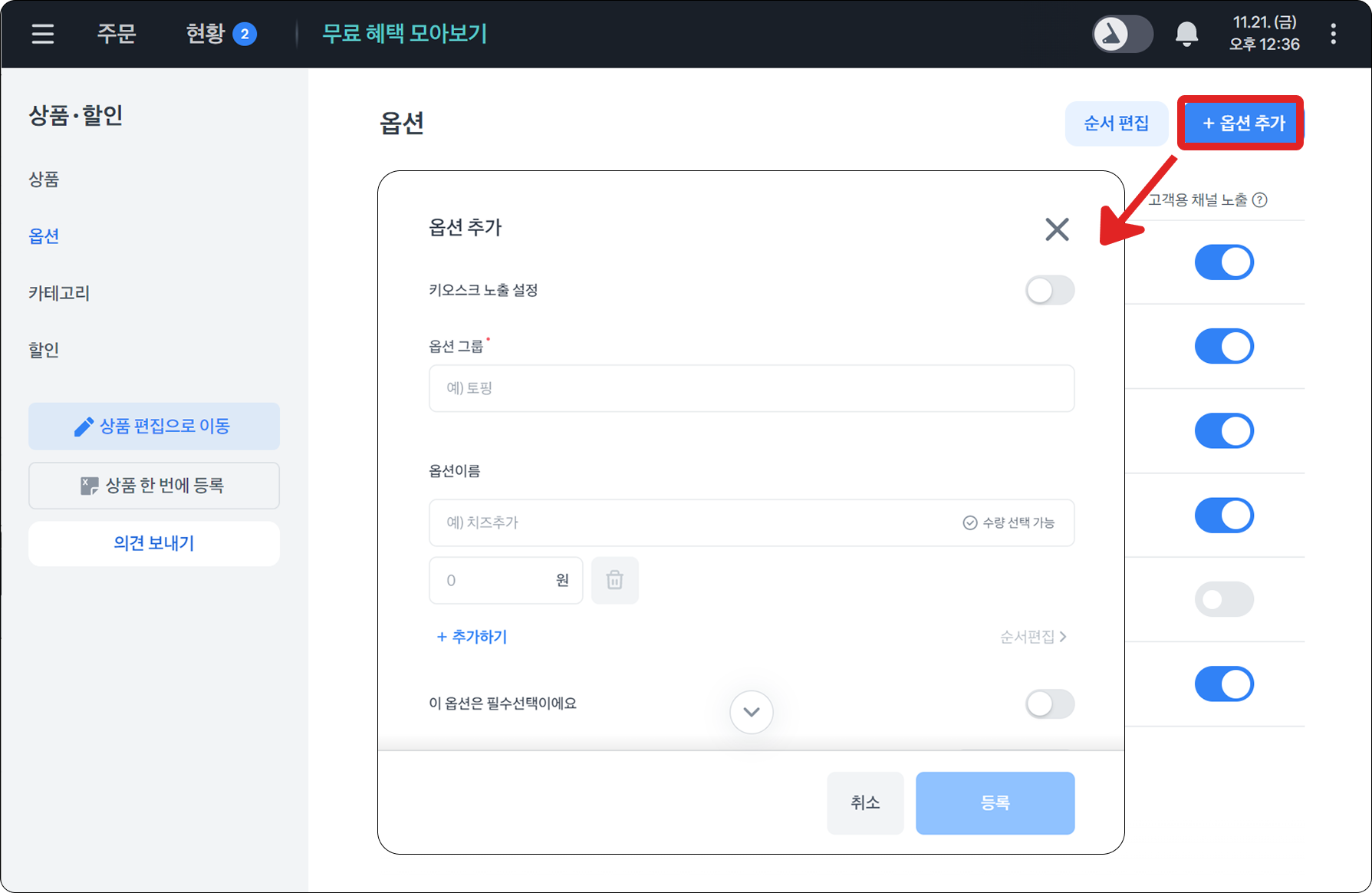 • 토스포스 외 주문 채널에도 옵션을 노출시키고 싶다면 ON