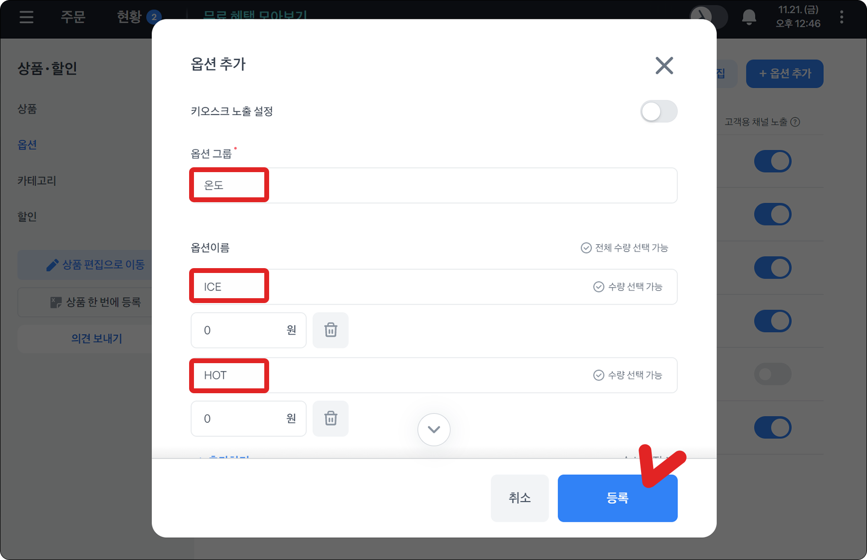 • 옵션 그룹에 온도를 입력하고, 아래 옵션이름에 ICE, HOT을 각각 적은 뒤 [등록] 버튼을 눌러 저장해주세요.