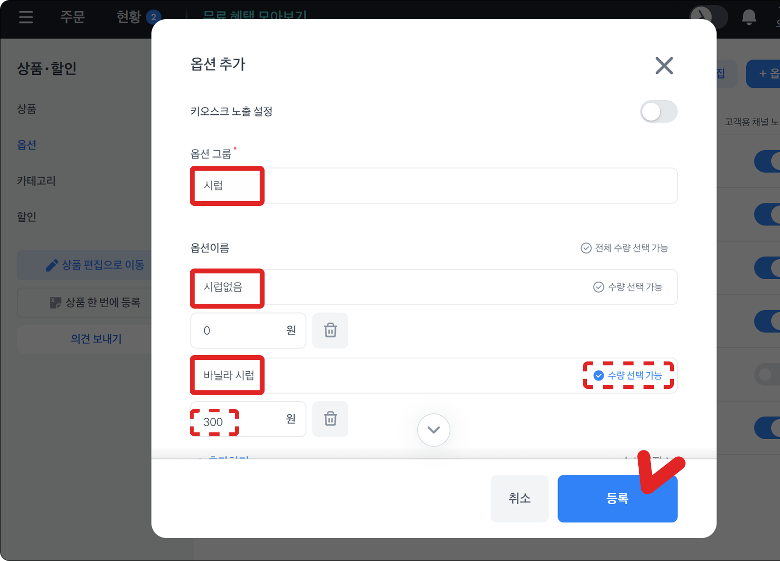 • 옵션 이름 : 옵션 그룹 안에 들어갈 세부 옵션이에요. (예시: 시럽없음, 바닐라 시럽)