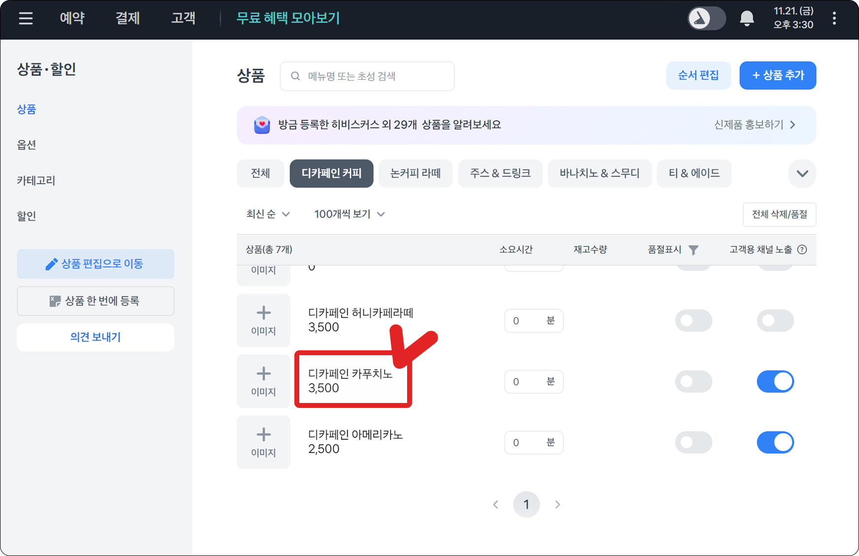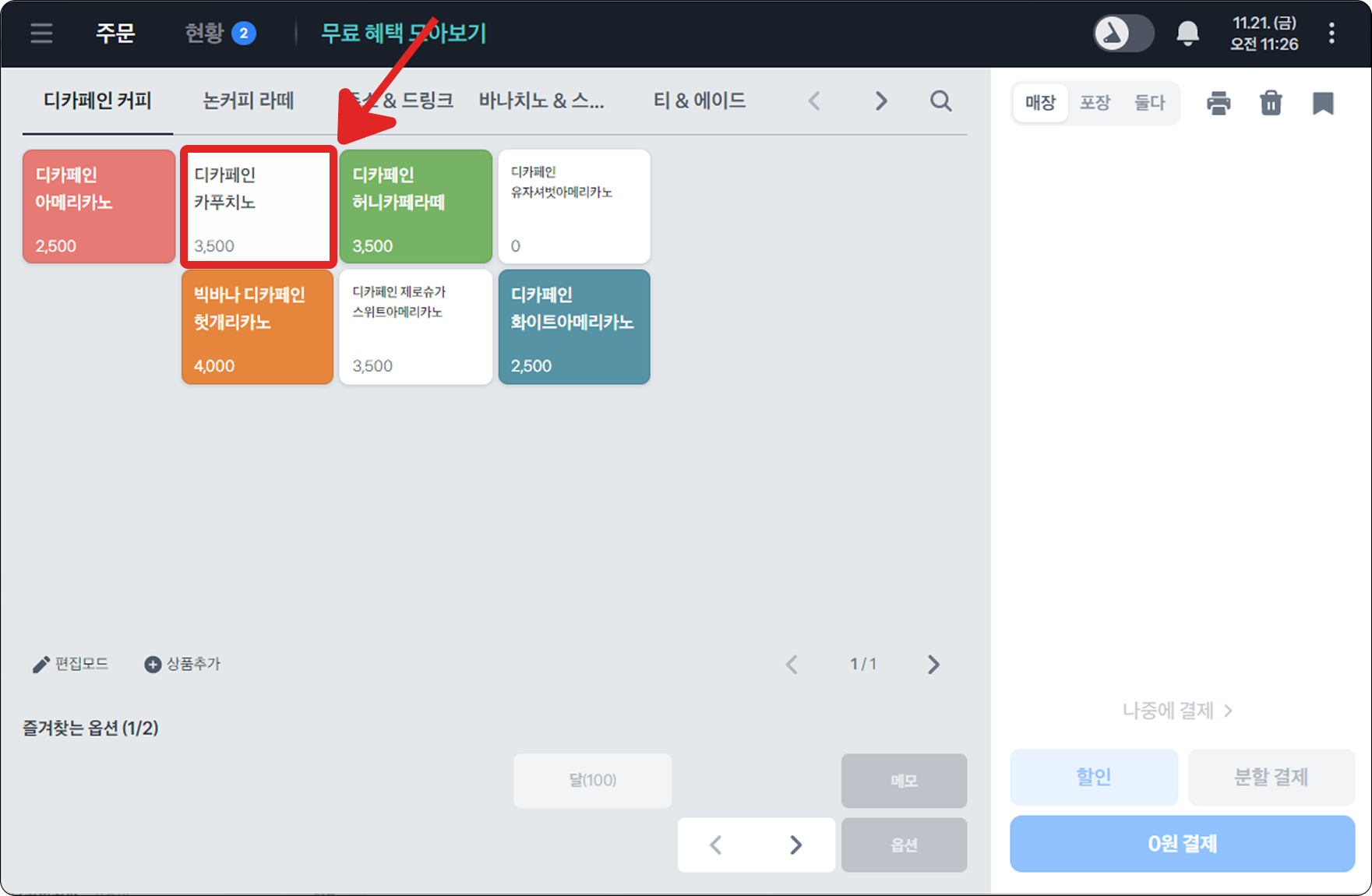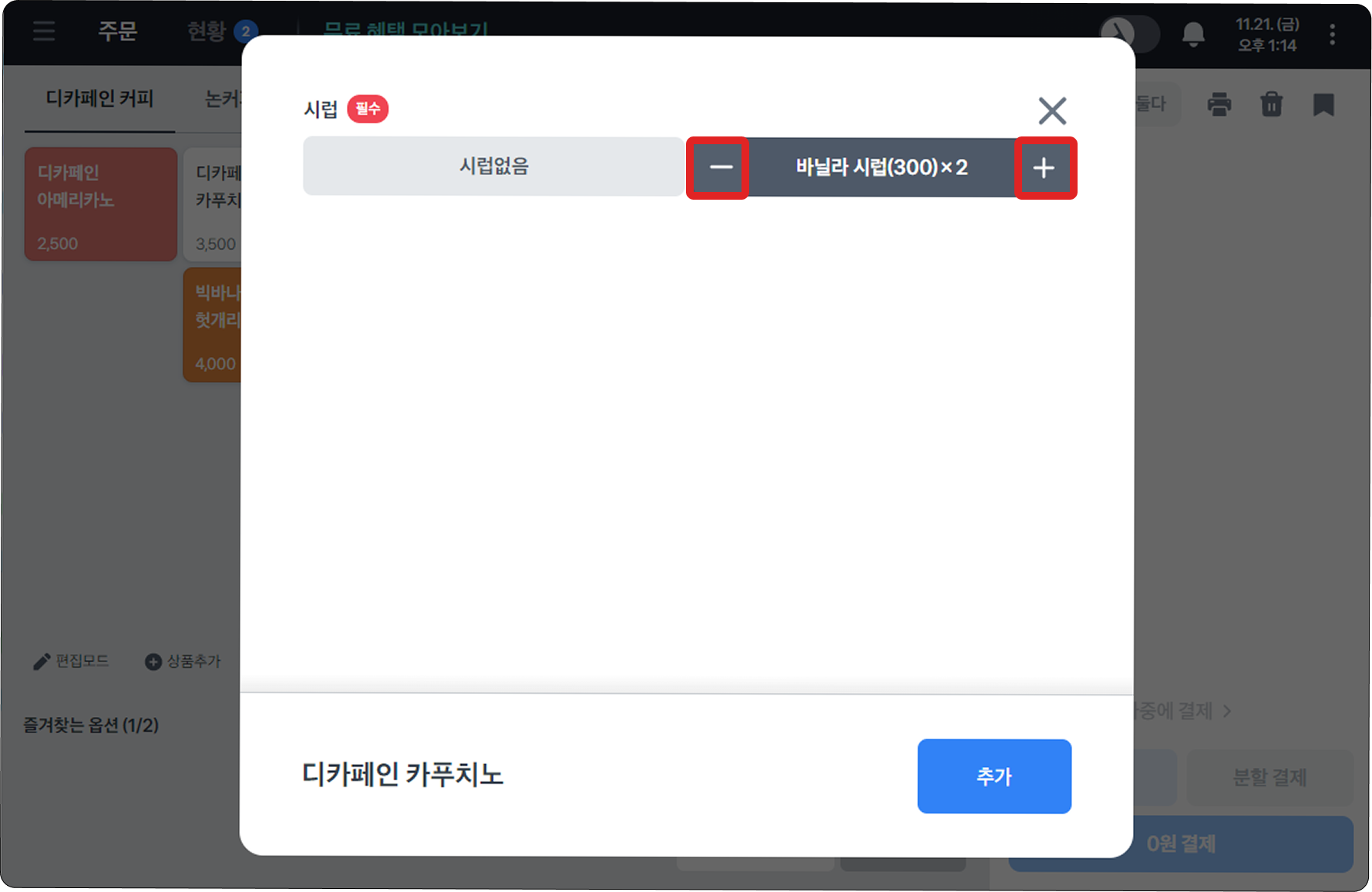 예시로 ‘디카페인 카푸치노’ 상품에 시럽 옵션을 추가해 볼게요.