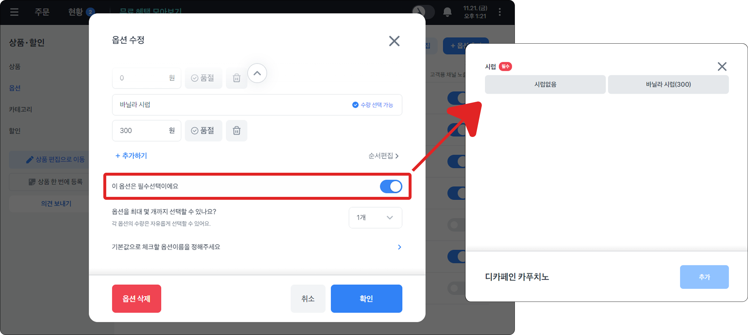 • 예: 아메리카노에 온도 옵션을 필수선택으로 설정 → 온도 선택 팝업 이 자동으로 뜸