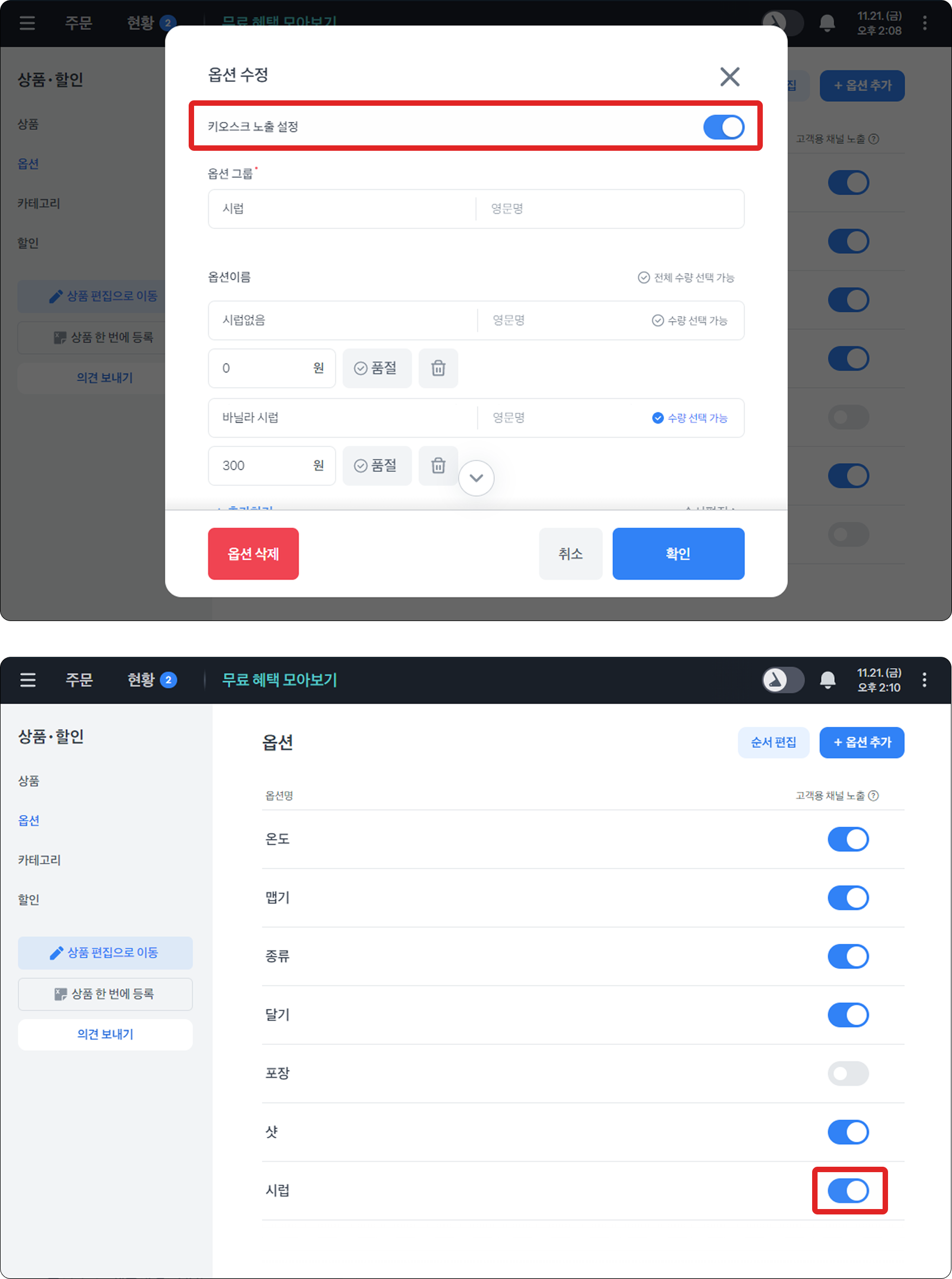 옵션을 신규로 만들 때 바로 켜도 되고, 이미 만들어진 옵션 리스트에서도 고객용 채널 노출 여부를 다시 설정할 수 있어요.