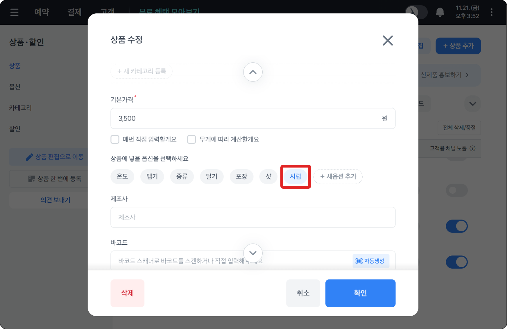1. 토스포스 왼쪽 상단 ≡ → [상품·할인] → [옵션] → [+옵션 추가]
