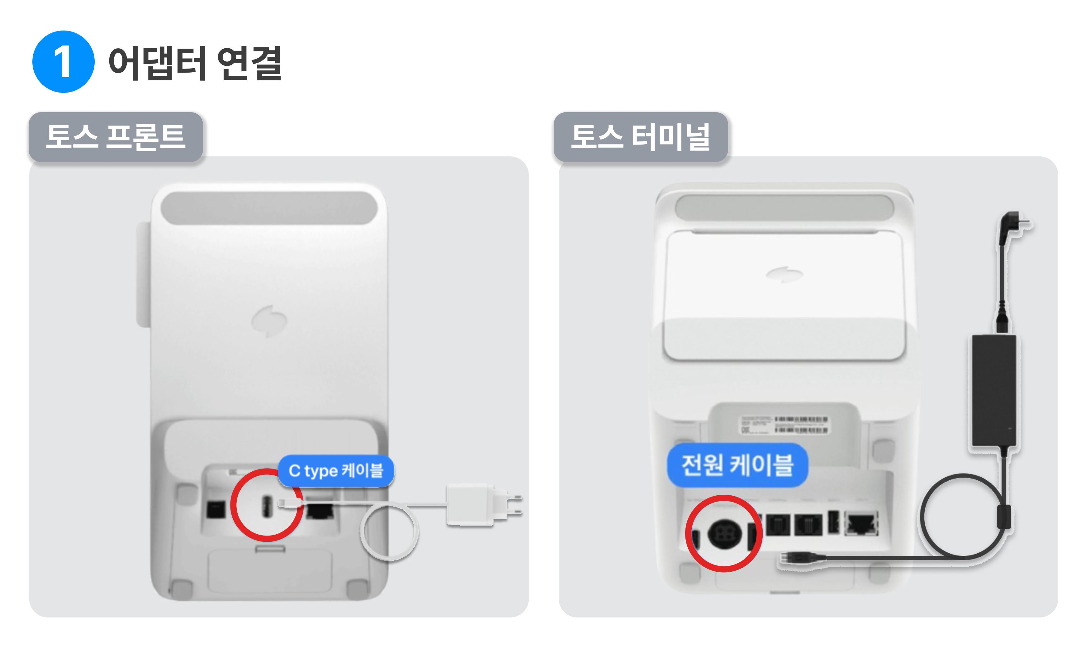 프론트와 터미널 뒷면 전원 어댑터를 연결해 주세요.