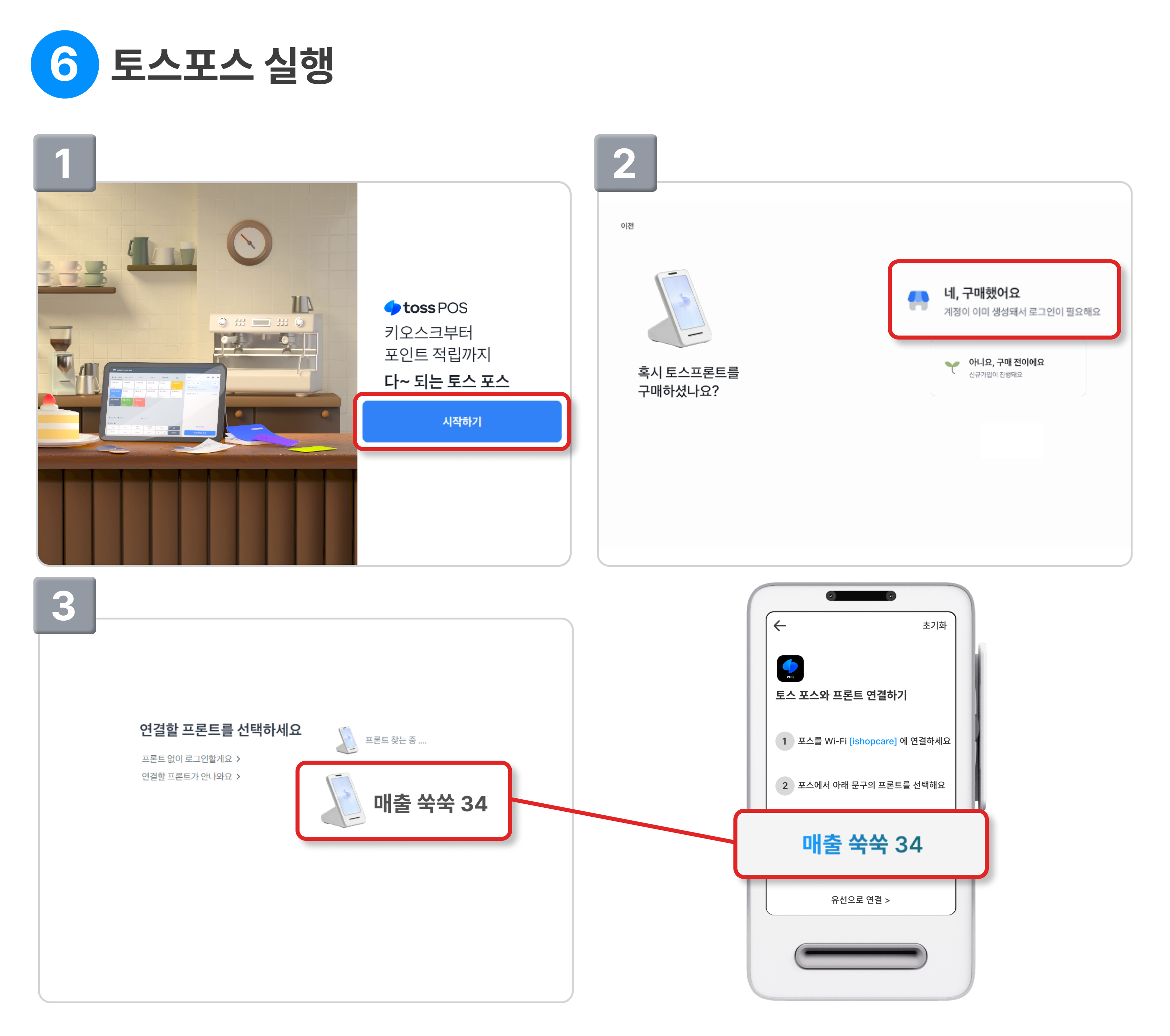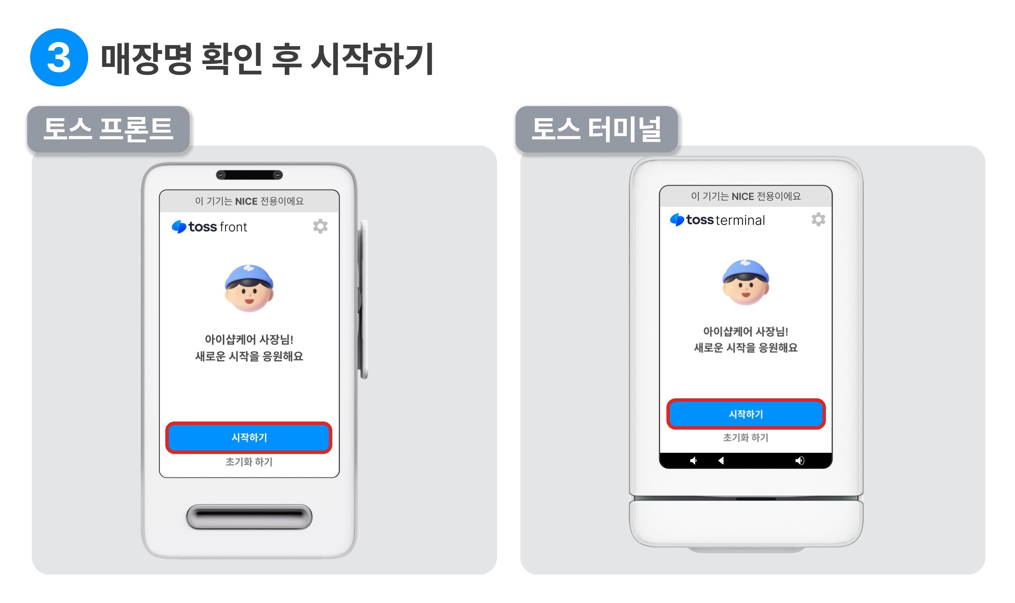 프론트와 터미널에 표기 된 매장명이 맞는지 확인하고, 시작하기 를 눌러주세요.