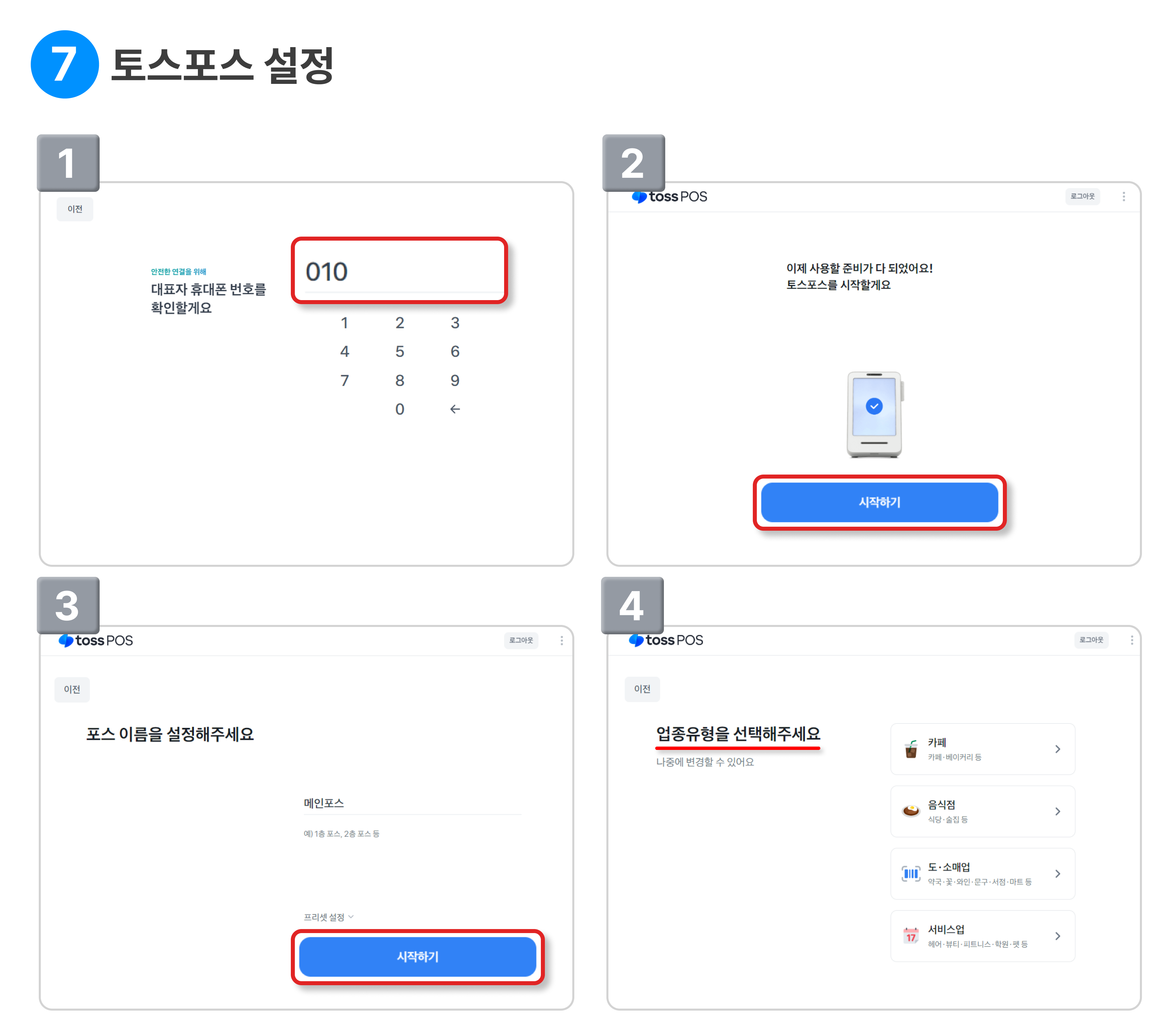 대표님 휴대폰 번호 입력 후 [시작하기] → 업종유형을 선택해주세요.