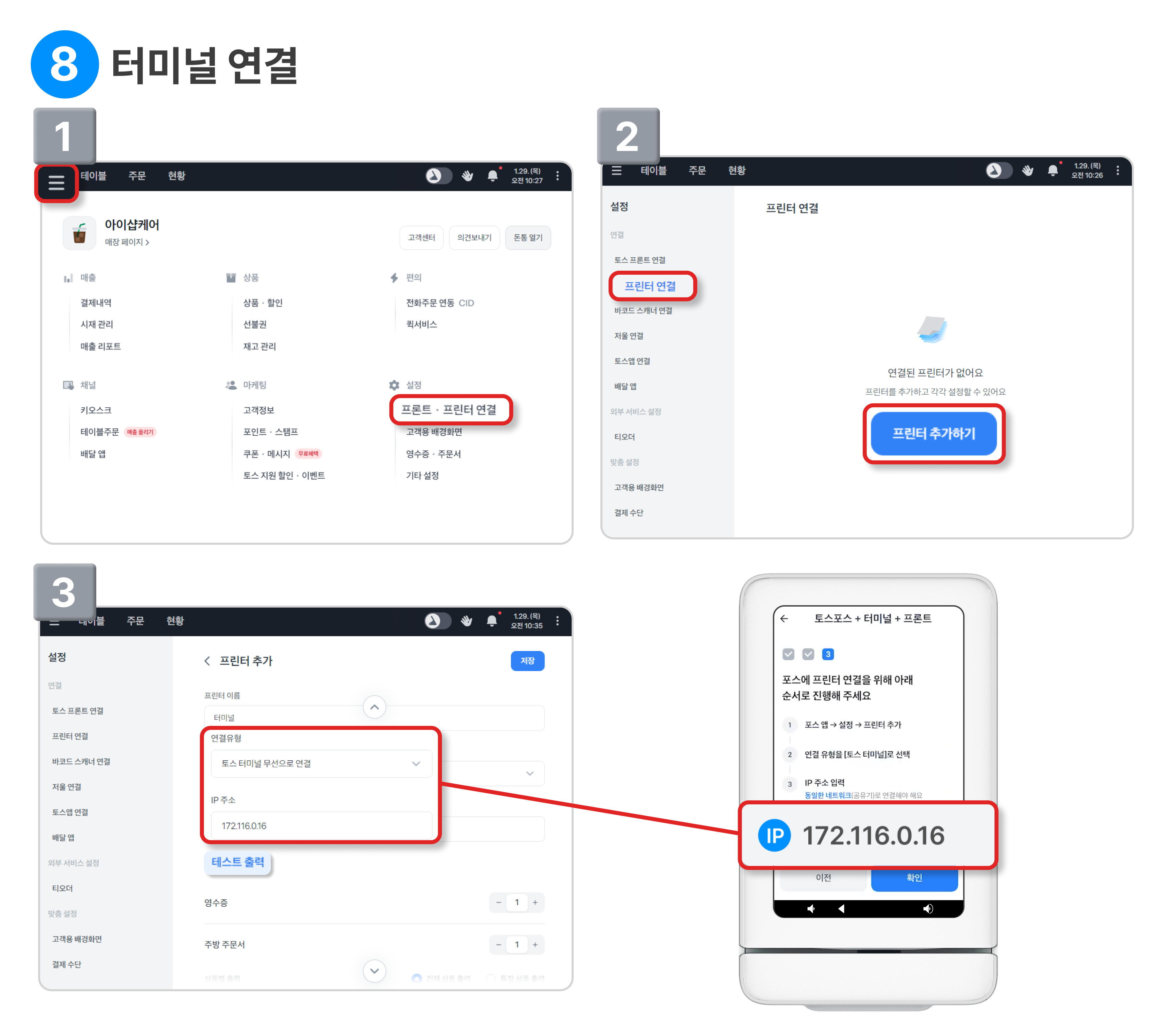 1.토스포스 왼쪽 상단 [ ≡ ] → 프론트·프린터 연결 → 프린터 연결 → 프린터 추가하기