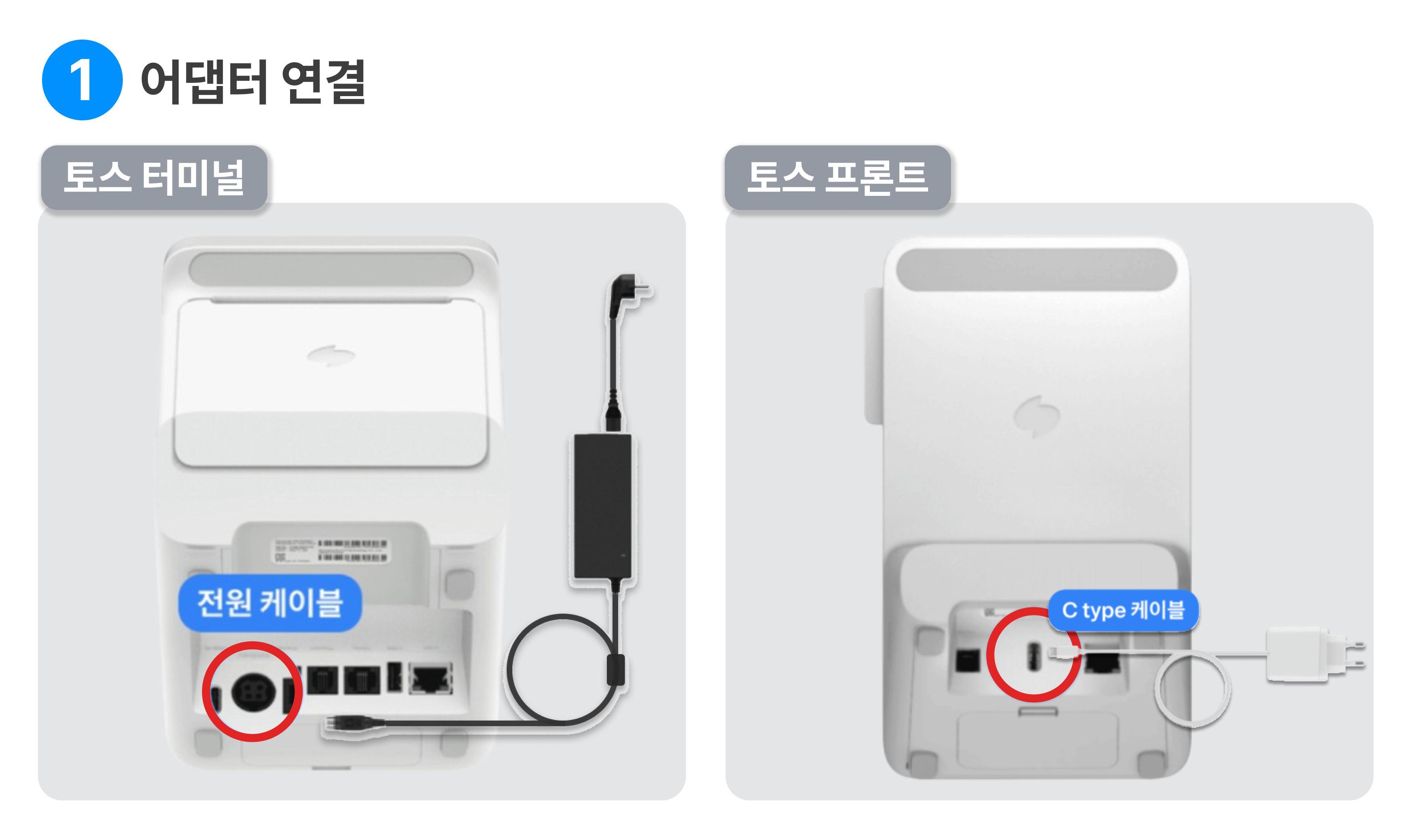 터미널과 프론트에 전원 어댑터를 연결해 주세요.