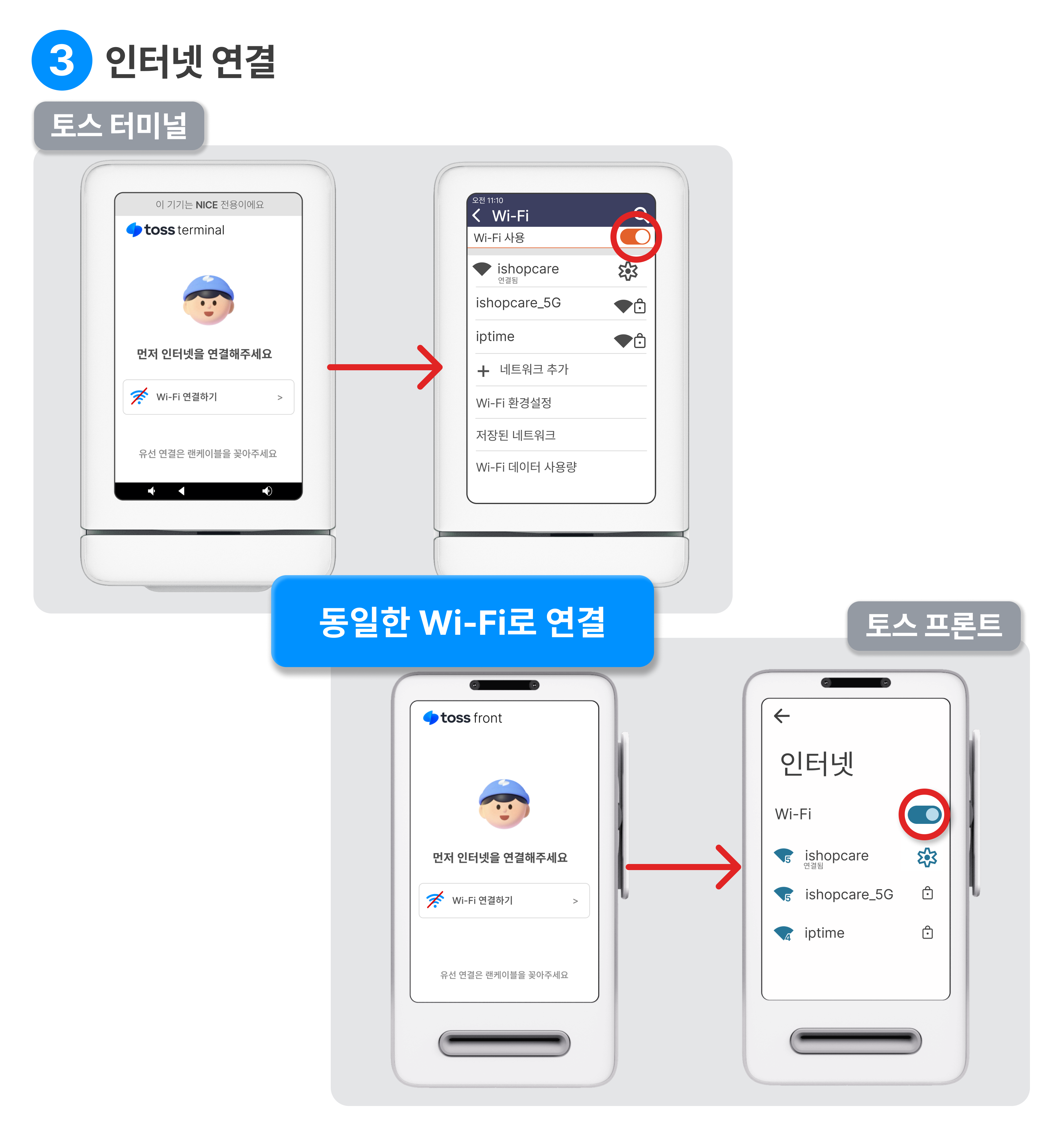 Wi-Fi 연결하기 를 눌러 터미널과 프론트를 동일한 Wi-Fi로 연결해 주세요.