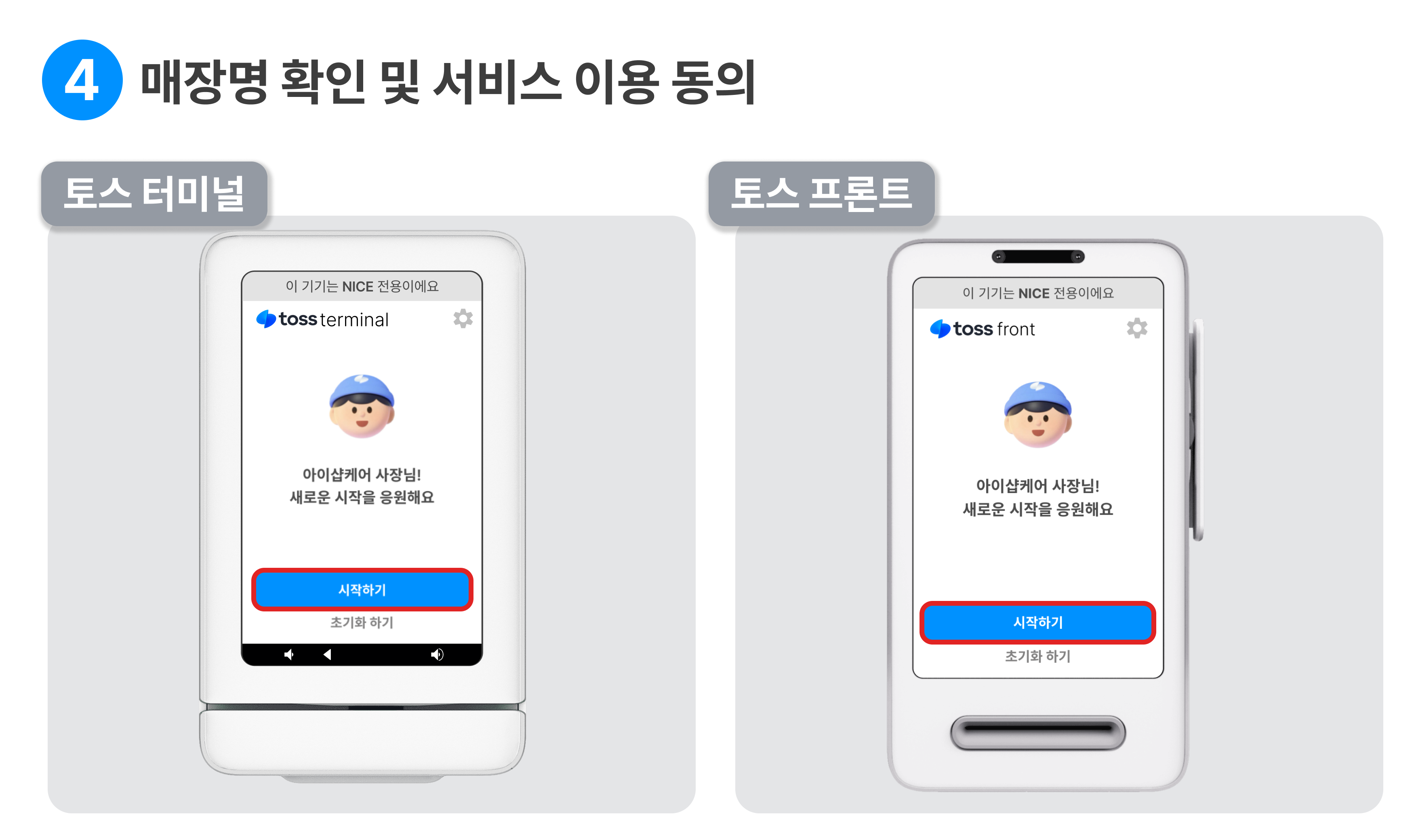 터미널과 프론트에 표기된 매장명이 맞는지 확인하고, 시작하기 를 눌러주세요.