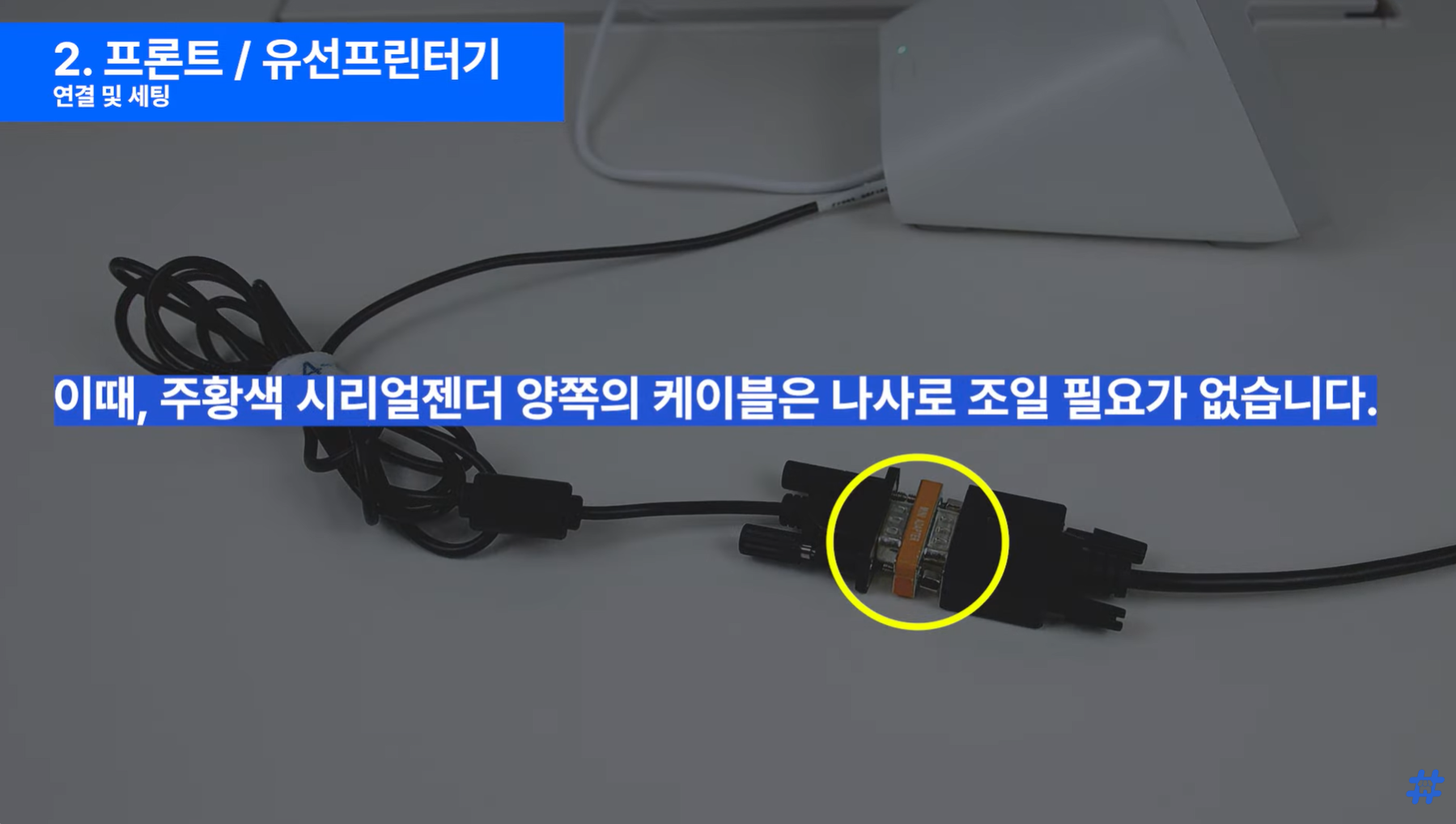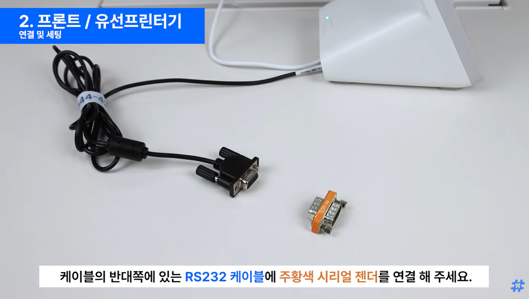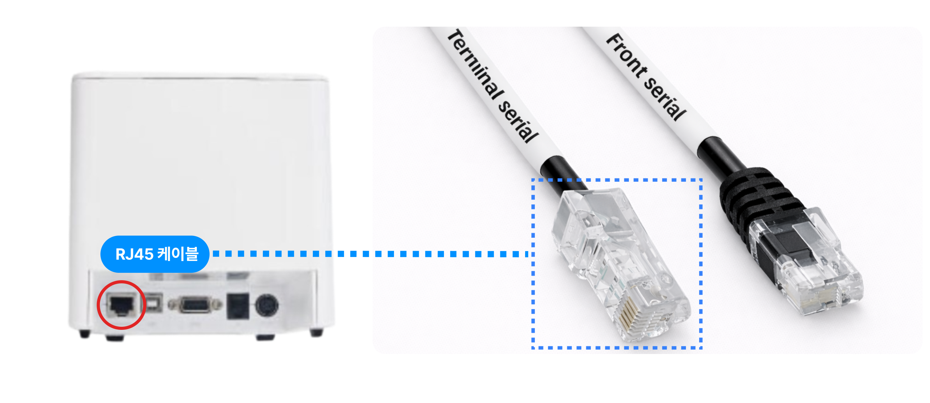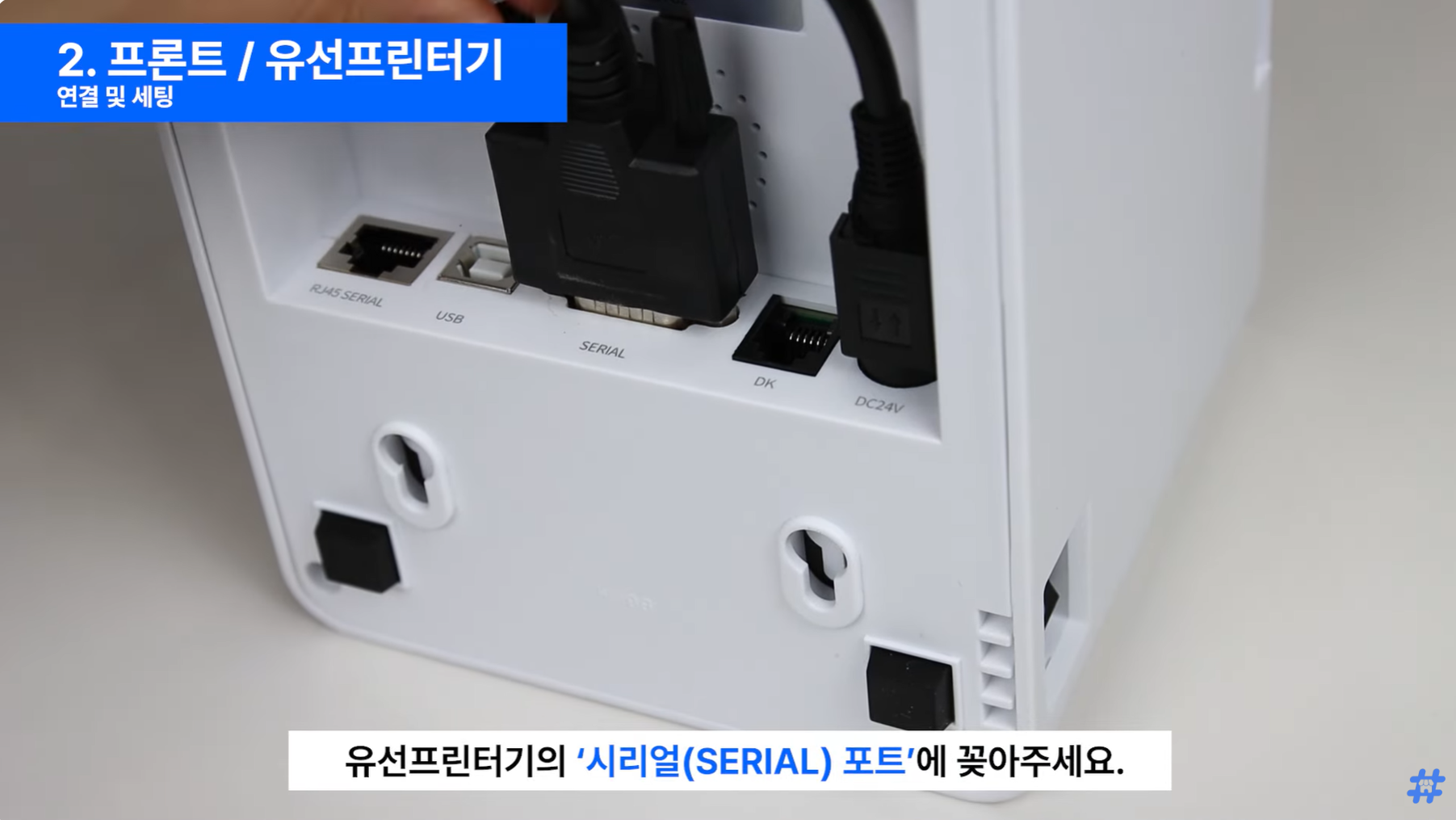 유선 프린터기 왼쪽 끝 RJ45 serial 포트에 연결해 주세요.