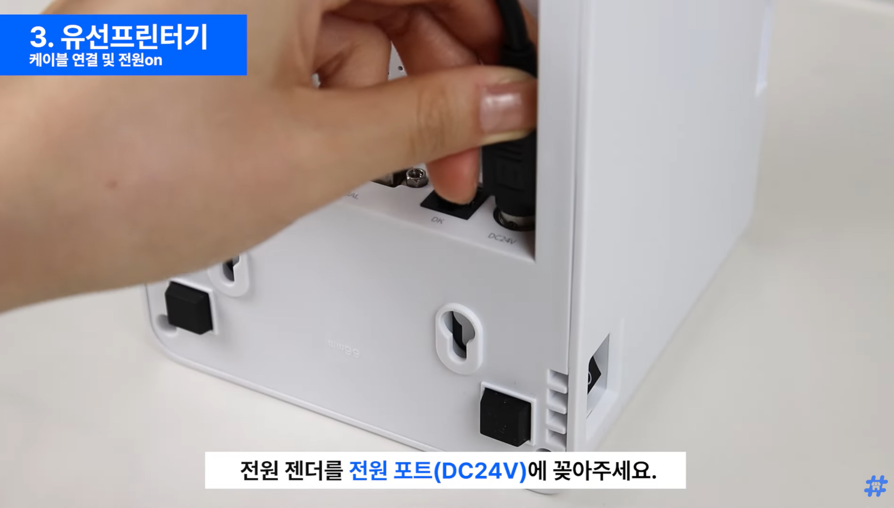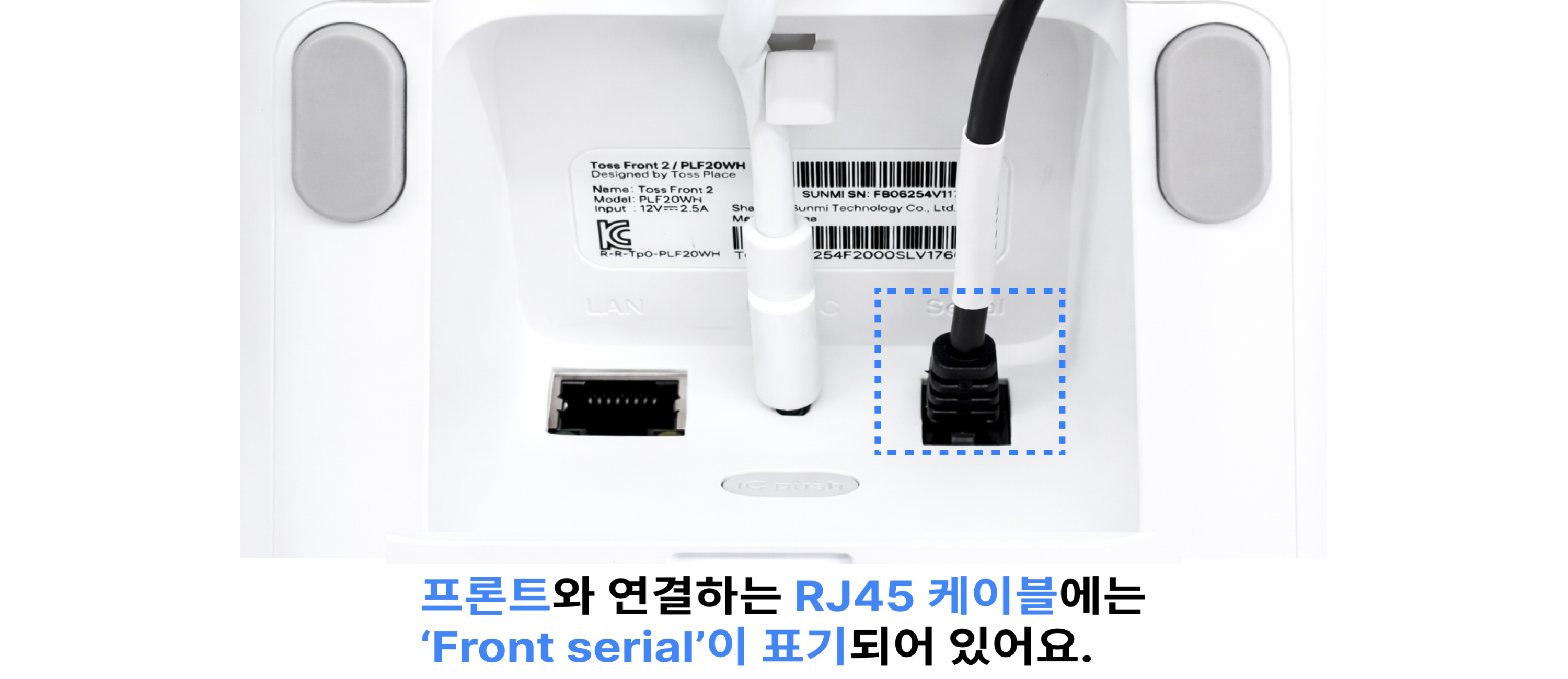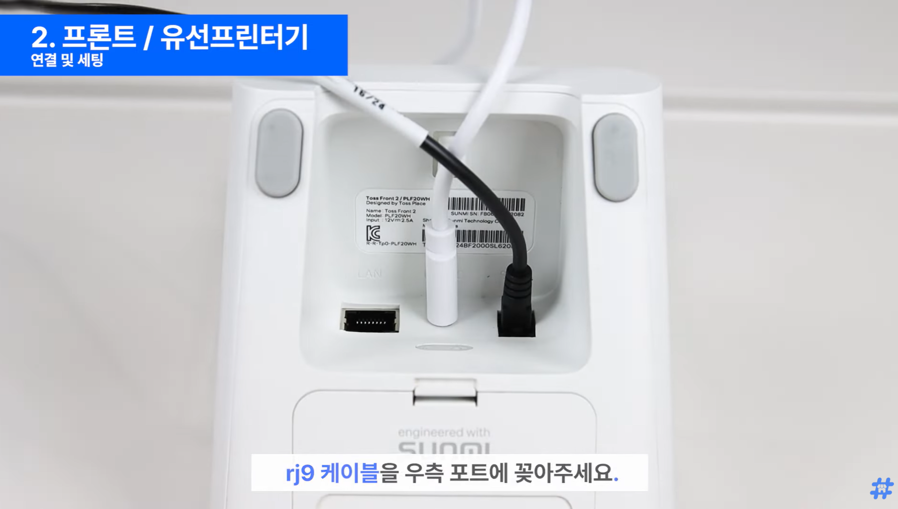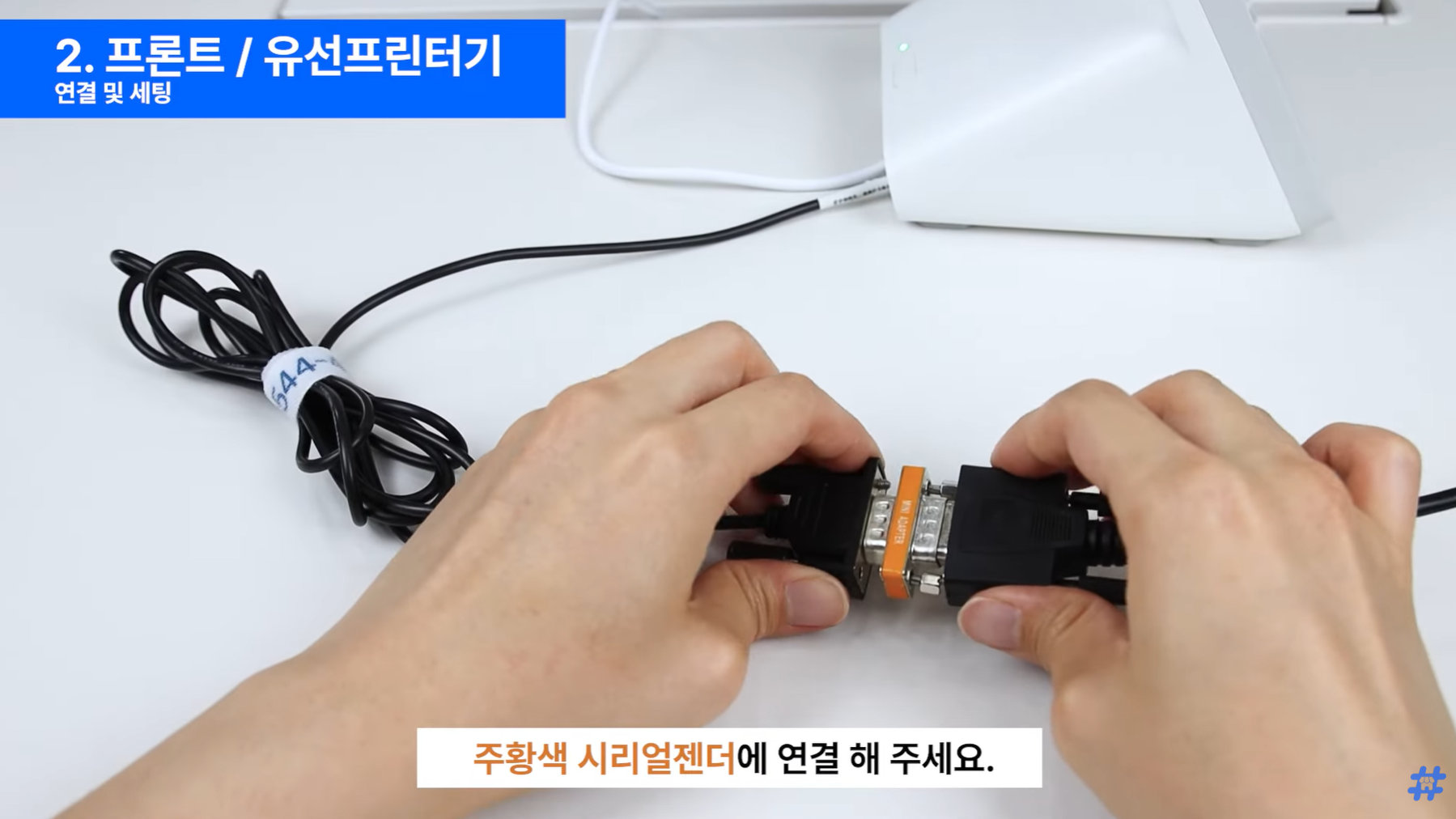 유선 프린터기 왼쪽 끝 RJ45 serial 포트에 연결해 주세요.