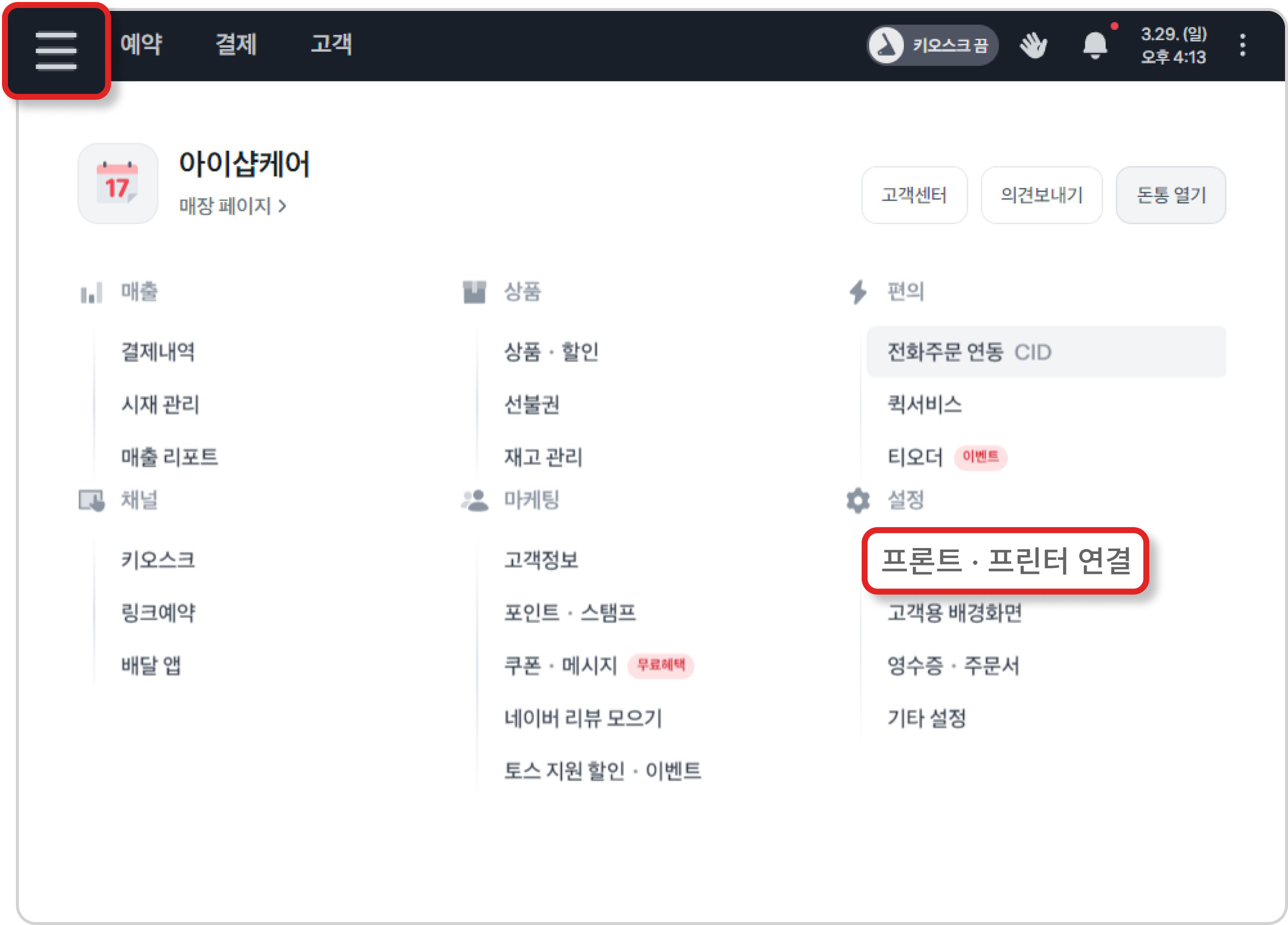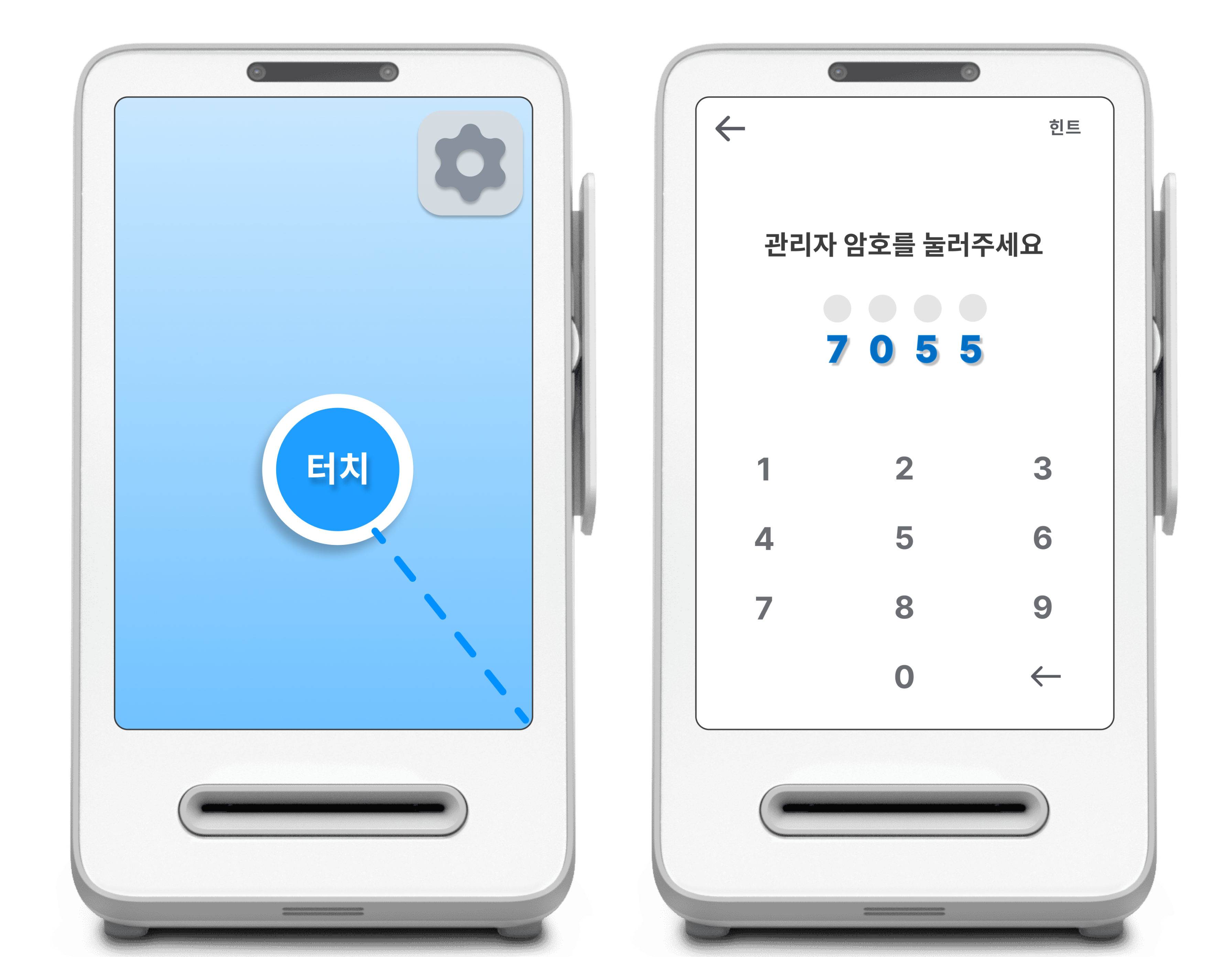 프론트 화면 터치 → 오른쪽 상단 톱니바퀴를 눌러 관리자 모드로 진입해주세요.