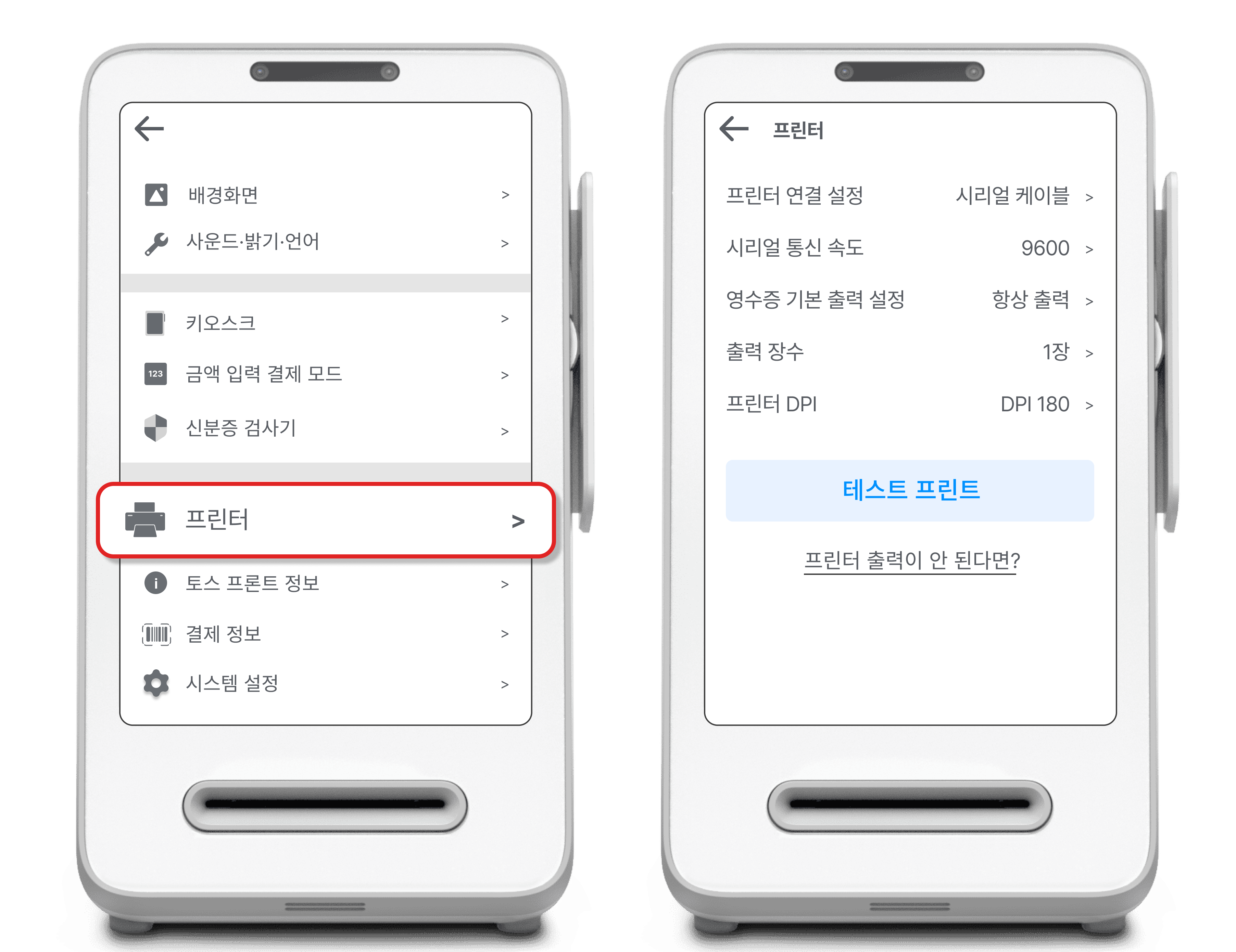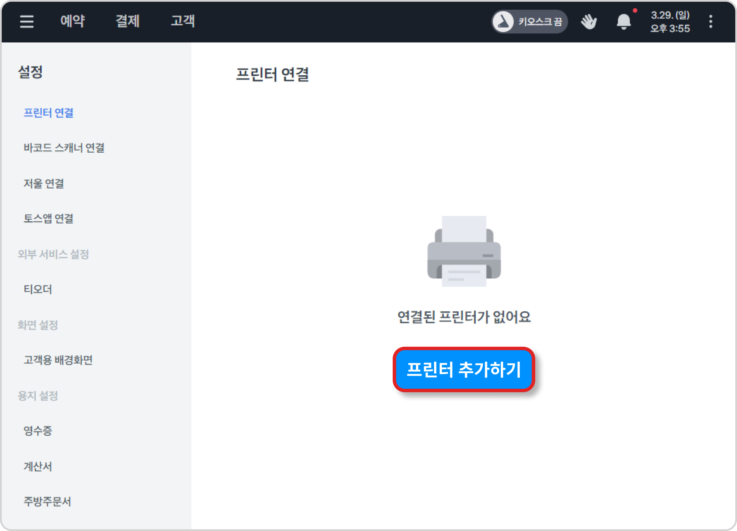 토스포스 왼쪽 상단 [ ≡ ] → 프론트·프린터 연결 → 프린터 연결 → 프린터 추가하기