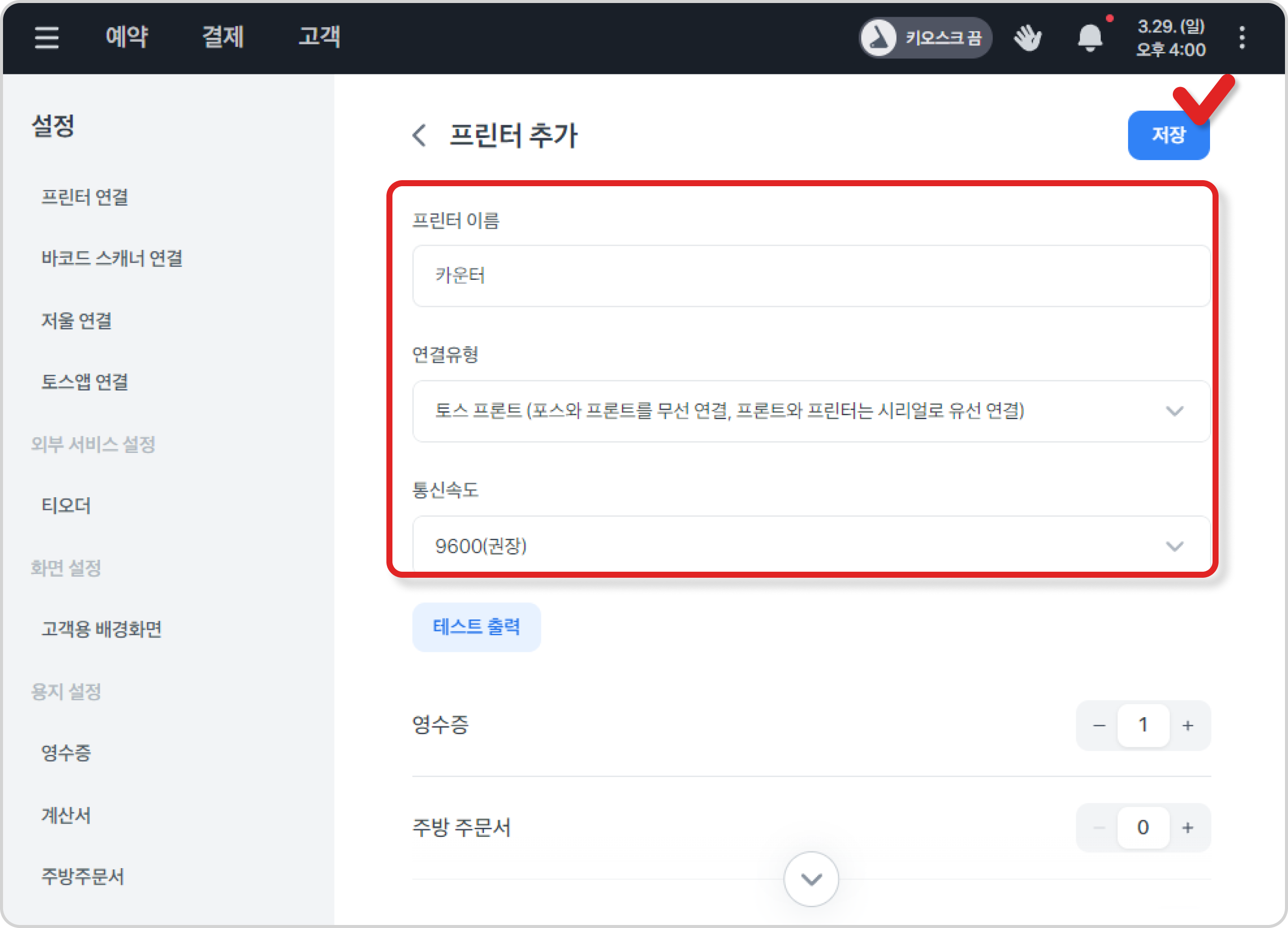 테스트 출력 버튼을 눌러 용지가 출력되면, 오른쪽 상단 [저장] 버튼을 눌러주세요.