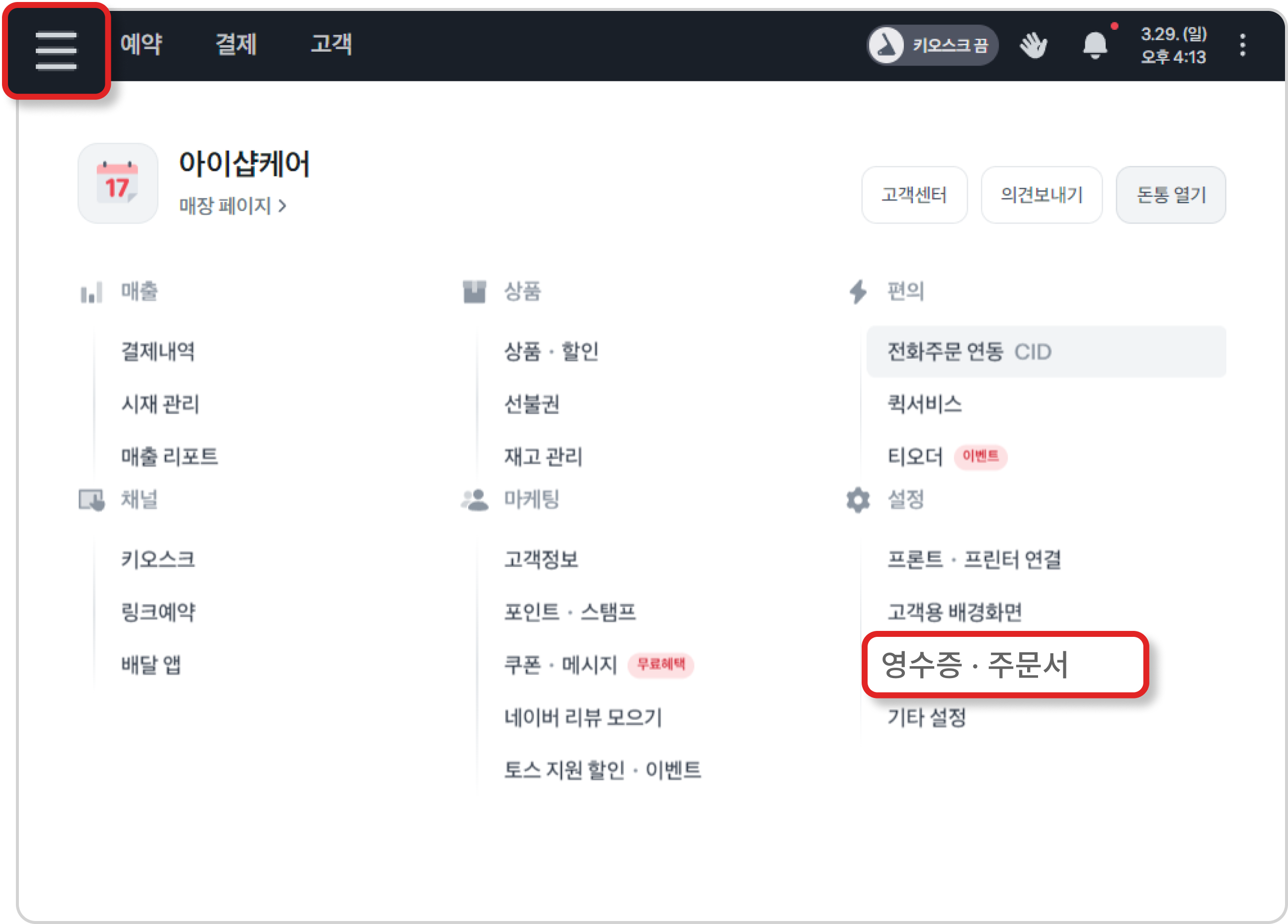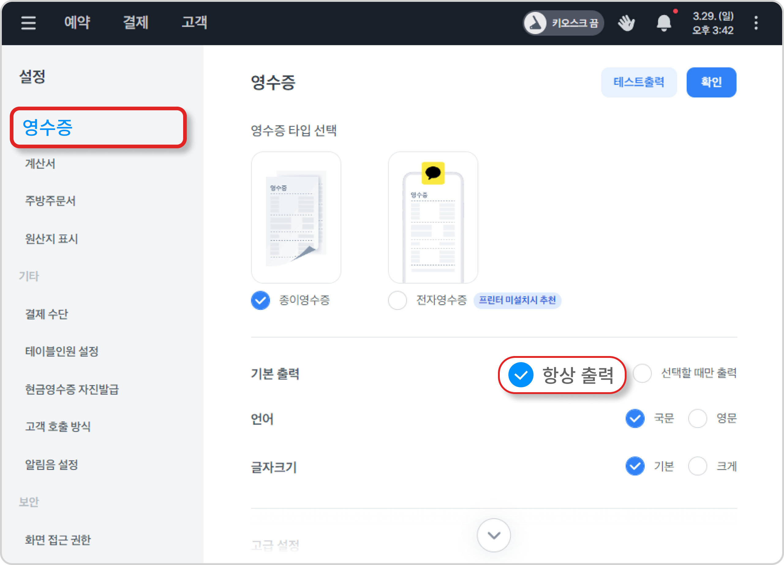 토스포스 왼쪽 상단 [ ≡ ] → 영수증·주문서 → 설정을 마무리 후 [확인]을 눌러주세요.