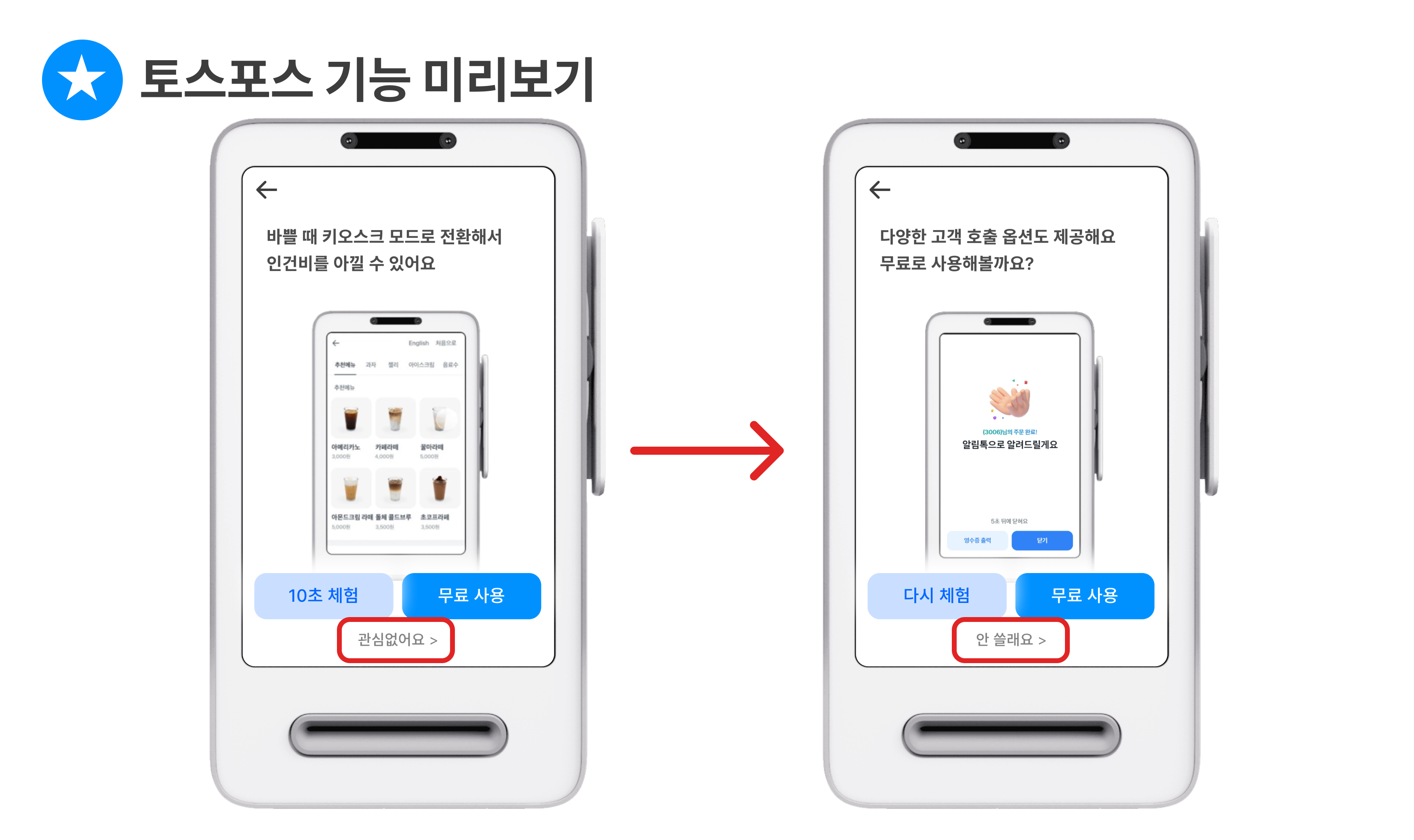 '토스포스 기능 체험 화면'이 나타나면 관심없어요 를 눌러 연결을 진행해 주세요.