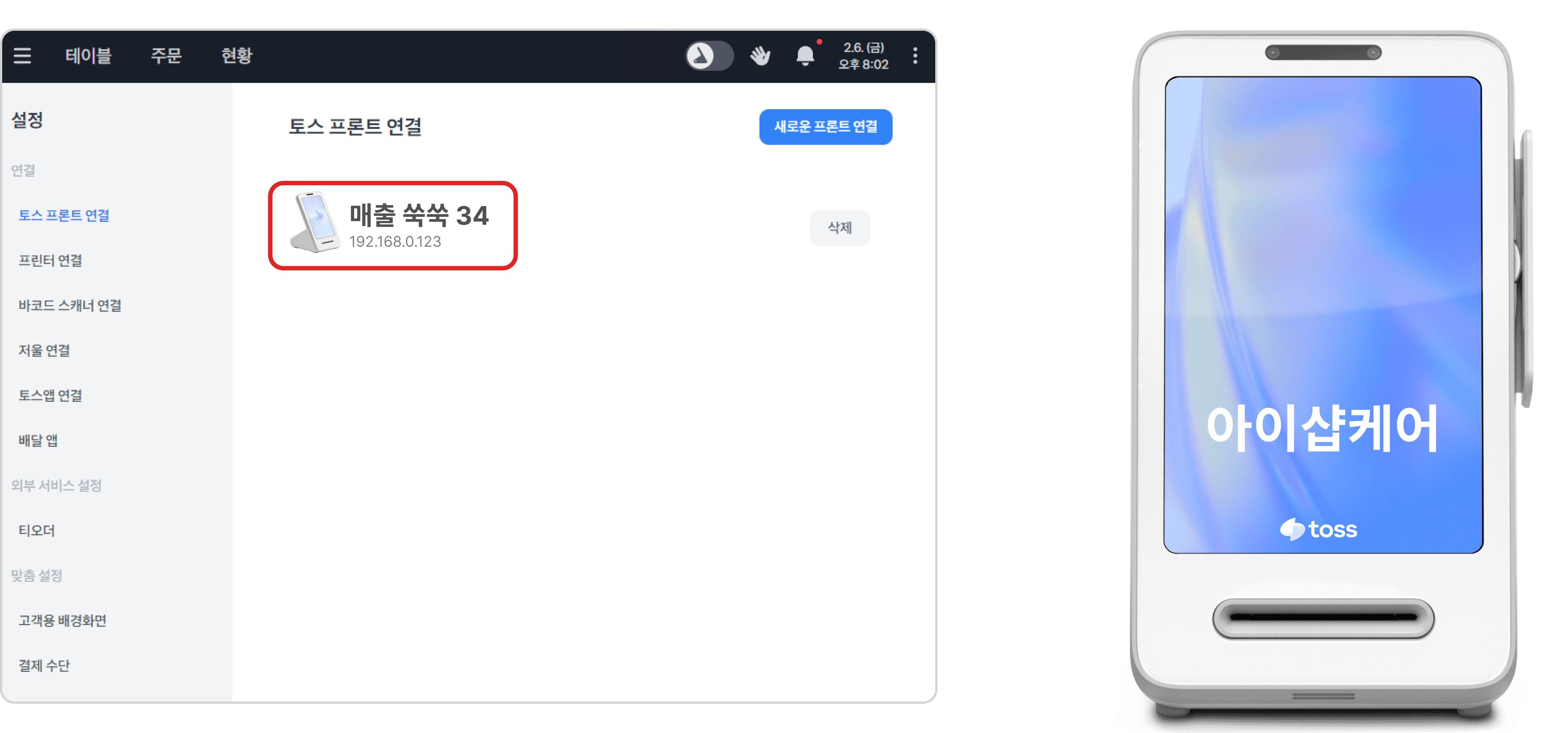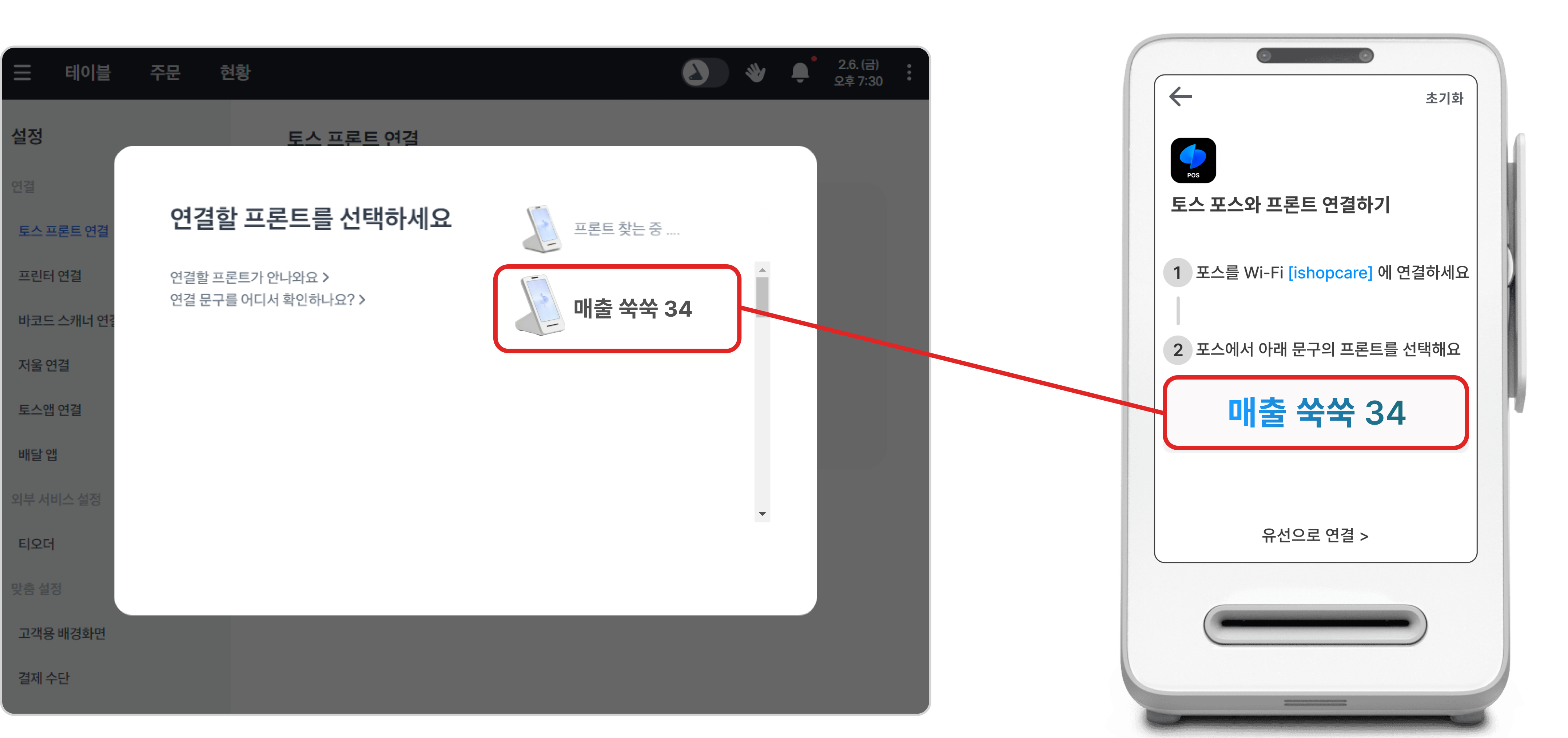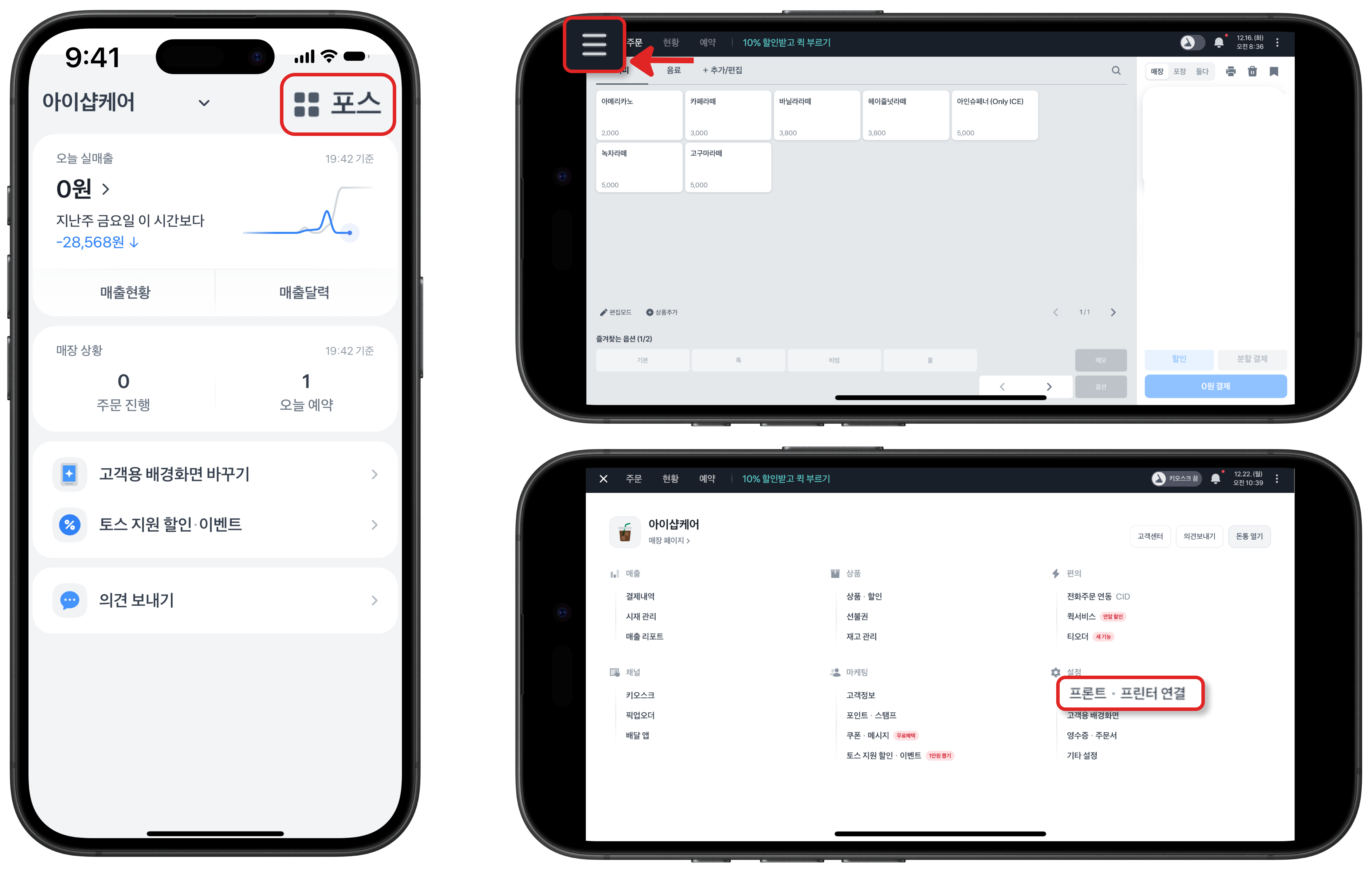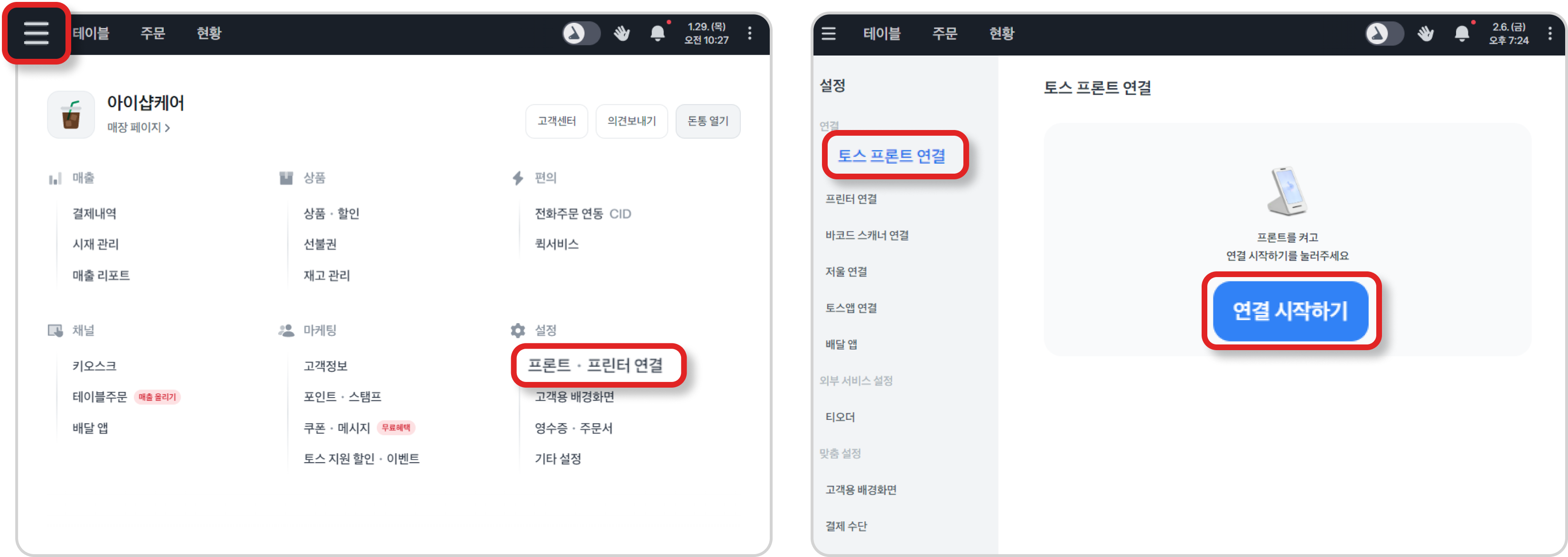 왼쪽 상단 [≡] → [프론트·프린터 연결] → 토스 프론트 연결 → [연결 시작하기]를 눌러주세요