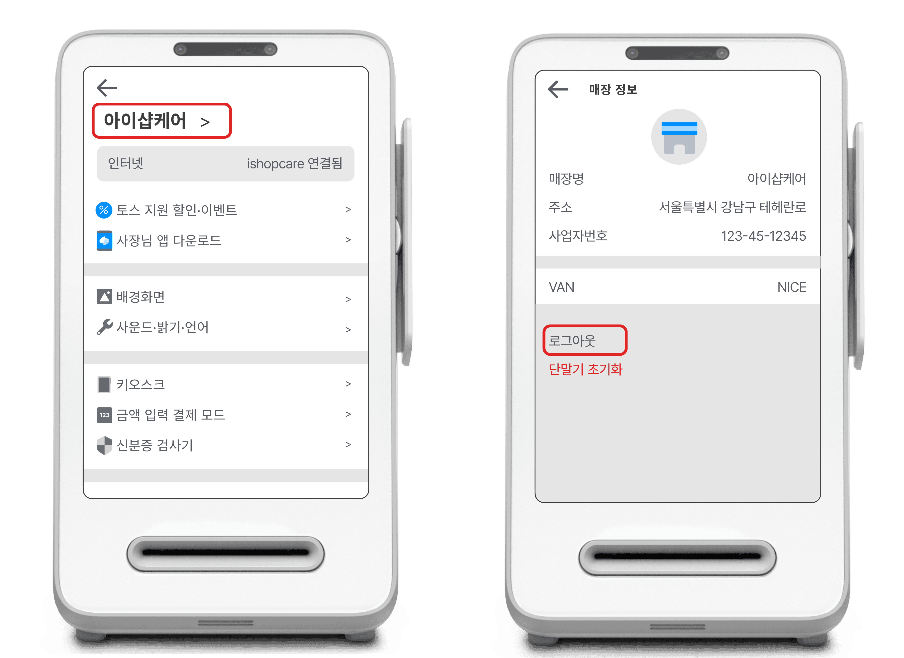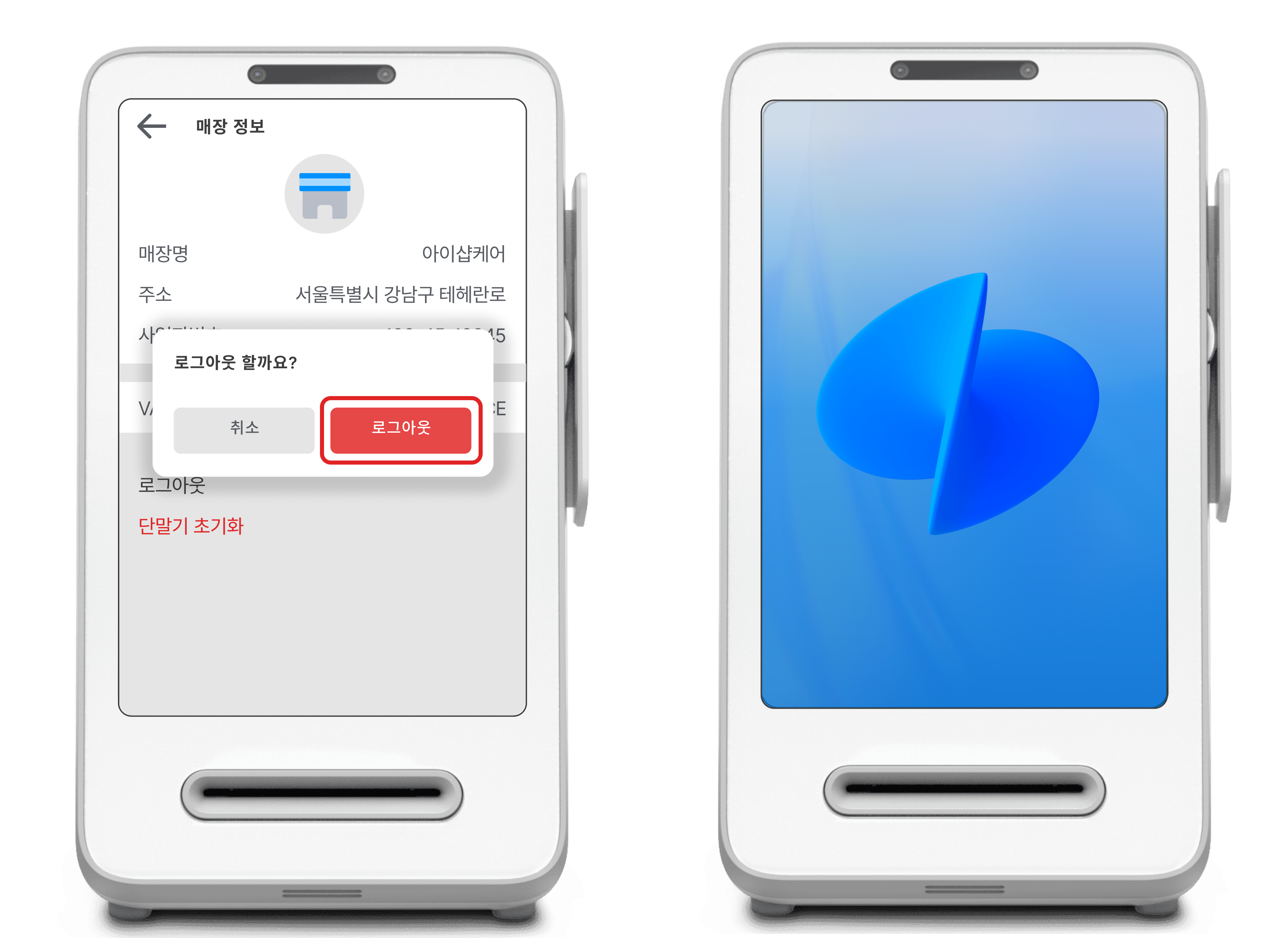 왼쪽 상단 [≡] → 매장명 아래 [내 매장 페이지] → 매장정보 → 로그아웃