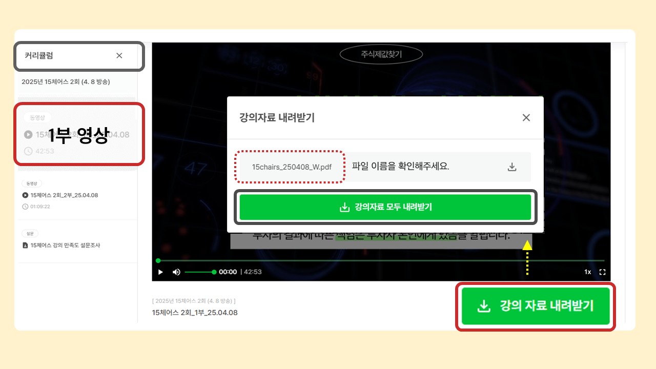 강의자료는 커리큘럼 "제1부" 영상화면 아래 [강의자료 내려받기] 버튼을 클릭하시면 다운로드 받으실 수 있습니다.