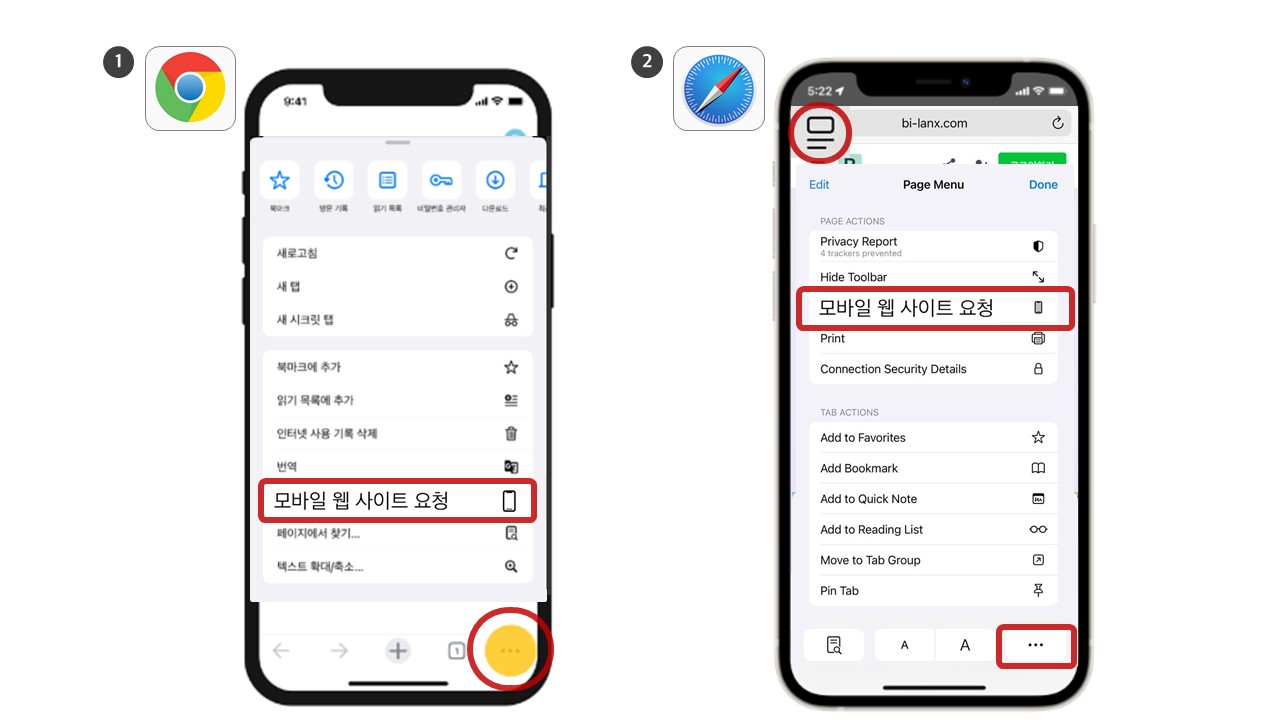 : 우측 하단 [점세개 ···] - (필요시) 아래에서 위로 화면 스크롤 - 메뉴 [모바일 사이트 요청] 선택