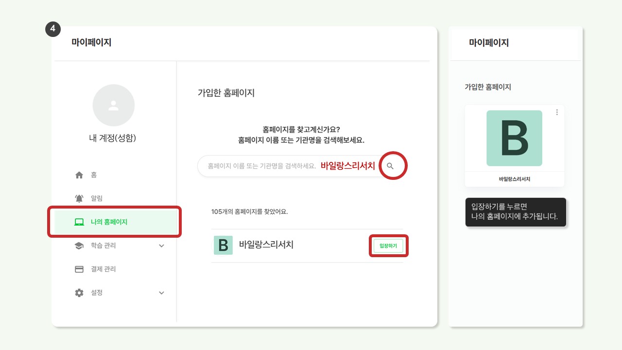 ④ 회원 가입 후 최초 로그인 시 [나의 홈페이지]로 이동합니다. 여기서 "바일랑스리서치"를 검색하여 [입장하기]를 눌러주세요.