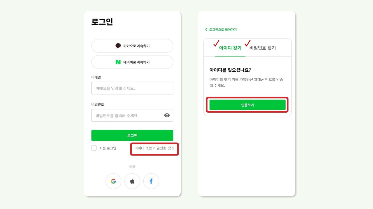 로그인 화면에서 [아이디와 비밀번호 찾기] 버튼을 누르시면 "본인인증"을 통해 해당 정보를 확인할 수 있습니다. 본인인증은 가입하신 휴대폰 번호로만 확인 가능합니다.