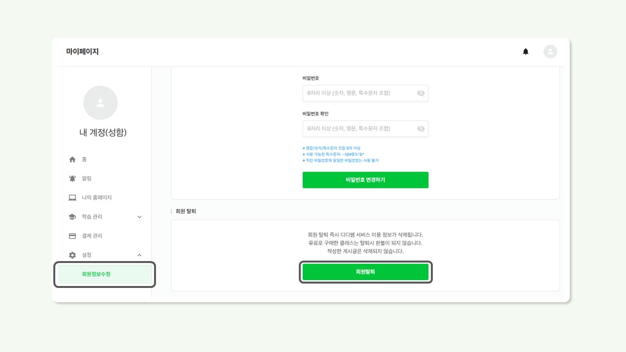 회원 탈퇴 시에는 디디쌤 서비스 이용 정보가 삭제되나, 유료로 구매한 클래스의 경우 탈퇴 이후에는 환불이 진행되지 않습니다.
