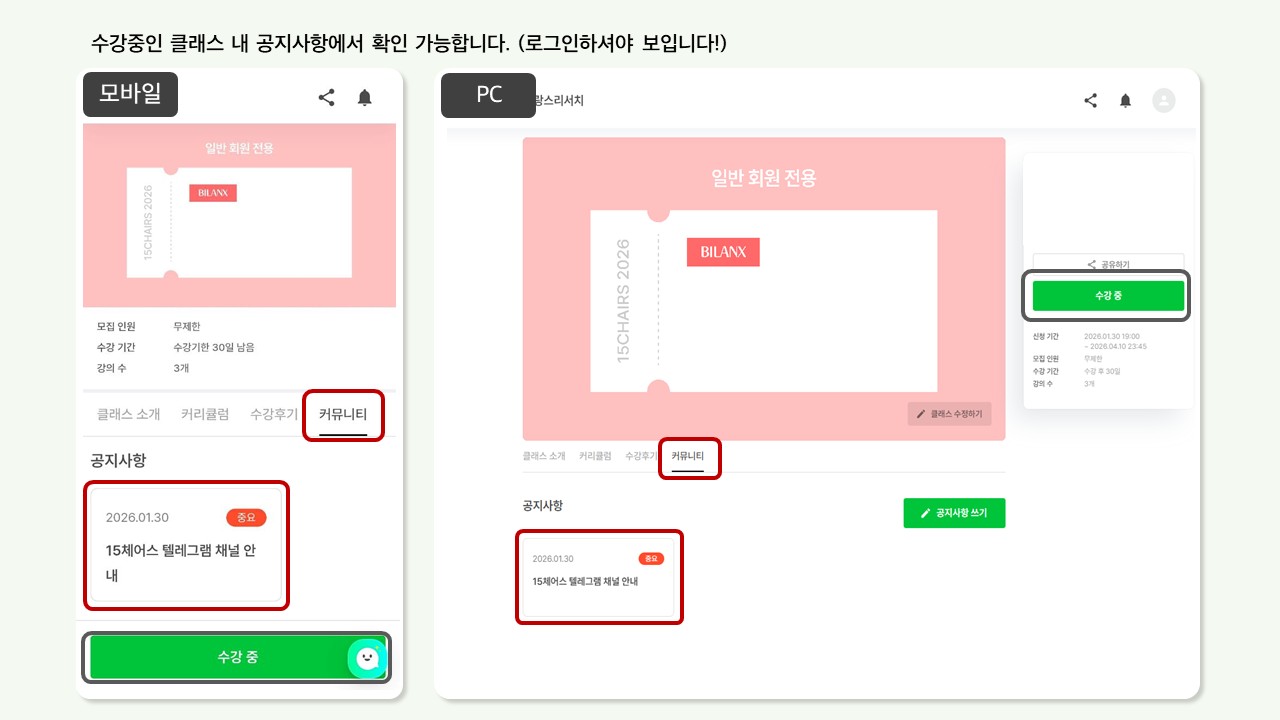 입장을 원하는 수강생 분들은 신청 클래스 내 [커뮤니티] - [공지사항]에서 해당 채널 주소를 확인하실 수 있습니다. (로그인해서 확인해주세요~)