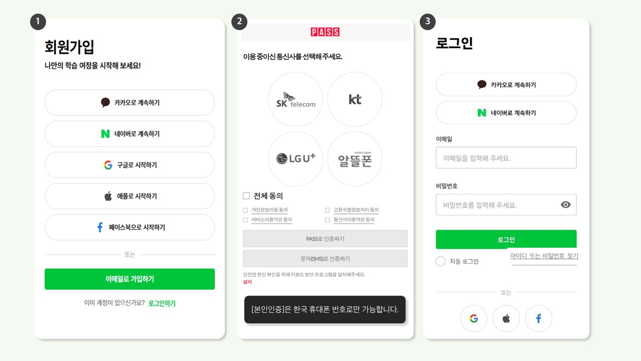 처음 접속 하신 분들은 휴대폰 본인인증을 통한 회원 가입을 한 차례 진행하셔야 합니다.