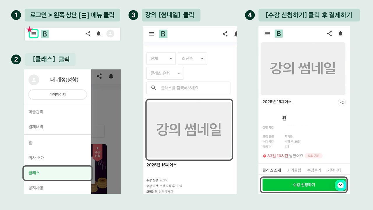 또한 왼쪽 메뉴 [≡] 를 눌러 [클래스] 를 선택하시면 내가 수강 신청할 수 있는 클래스들을 찾아보실 수 있습니다.
