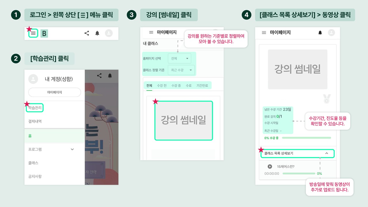 ③ 로그인 후 왼쪽 메뉴 [≡] 를 눌러 [학습관리]를 선택, 해당 회차 "썸네일"을 클릭 후 [클래스 목록 상세보기]에서 영상 재생하기